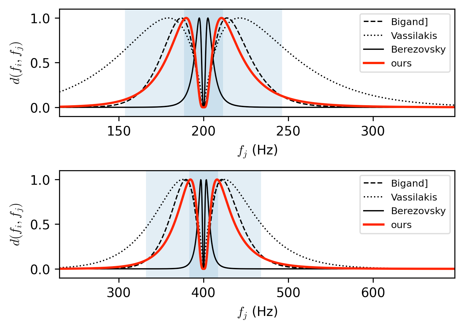 Note, how $d$ depends on both $f_i$ and $f_j$, where in the top plot $f_i = 200$ Hz, and in the bottom plot $f_i = 400$ Hz. This is because the maximum reported dissonance is related critical bands, i.e., the resolution of human hearing, which can be split into different frequency-dependent bands. In the experiments of Plomp and Levelt, the maximum was reached at around 0.25 critical bands, which is reflected by the darker shaded blue area in the plots above.