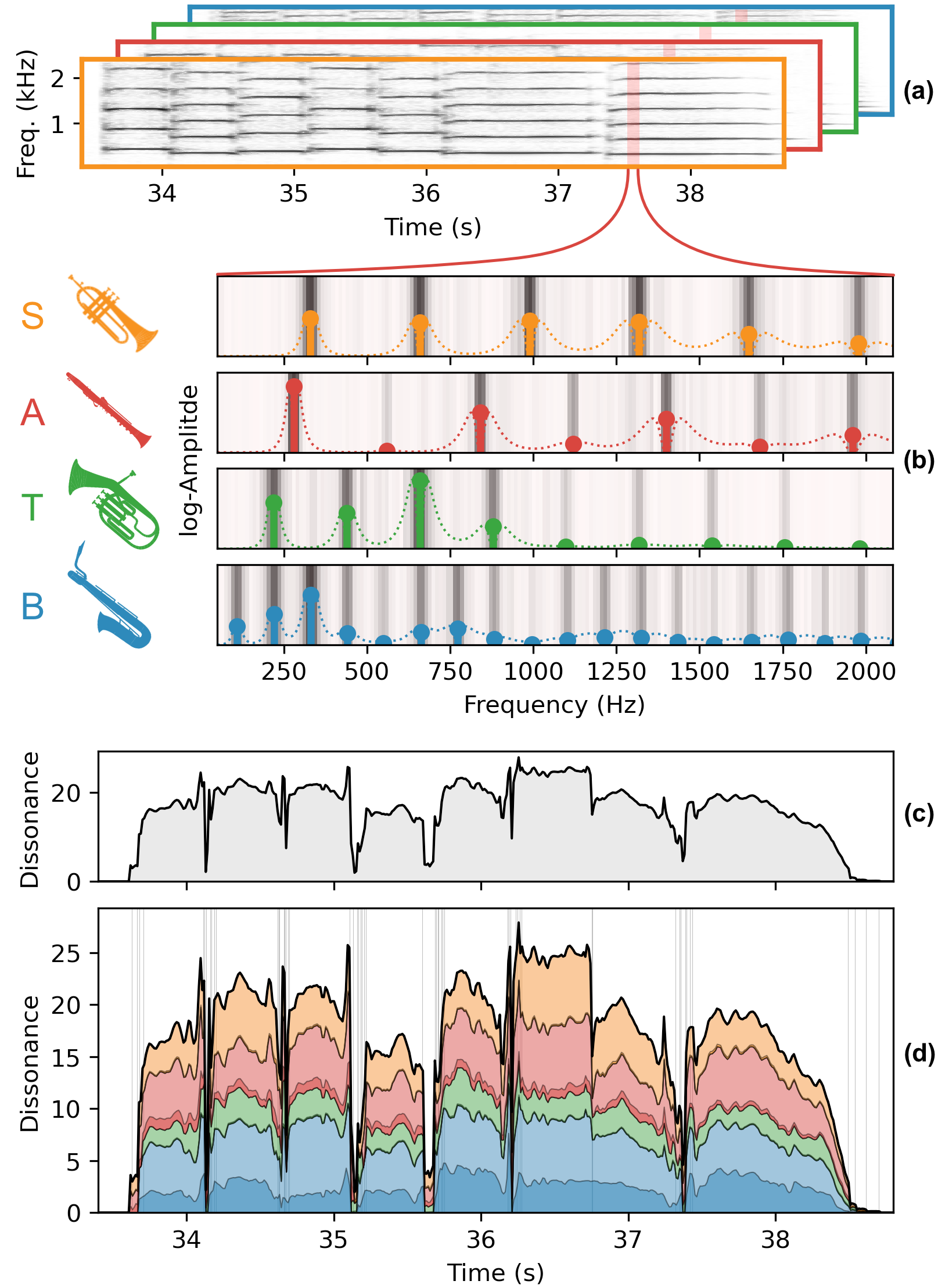 The audio player below provides individual tracks for the running example that is used to illustrate the dissonance measure throughout the paper, e.g., in Figures 1 (also shown above), 6, and 7. By activating and deactivating the respective tracks with the check mark on the left, you can replace the bass (B) voice with a baritone sax recording that is equalized, or where the excerpt is played in fortissimo, as described in Sections 3.1 and 4.