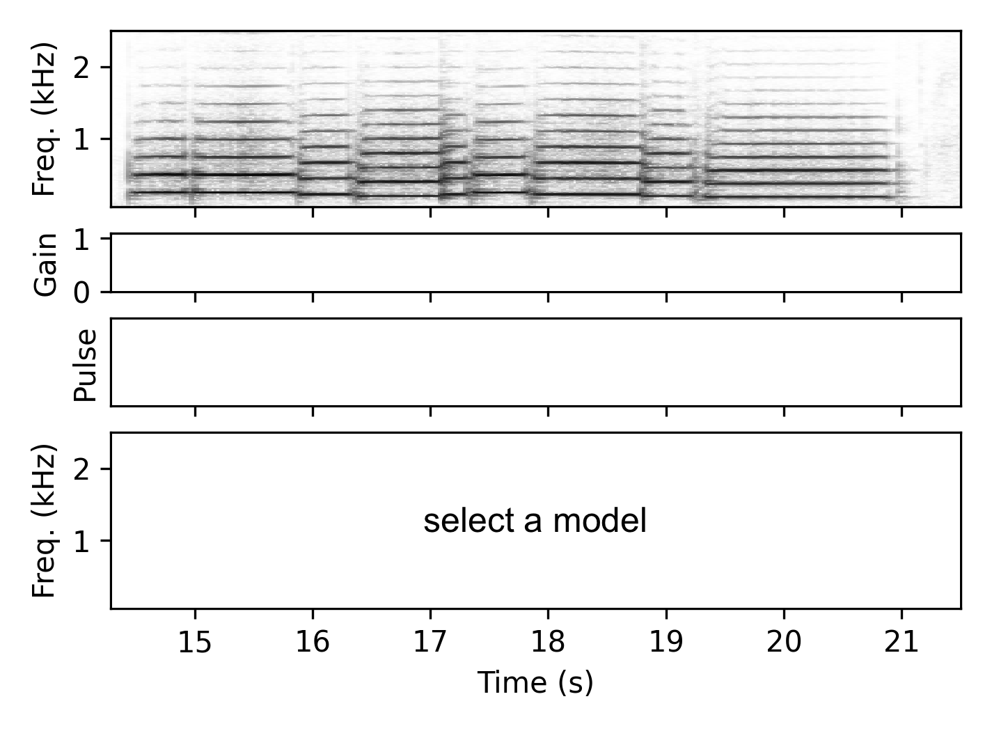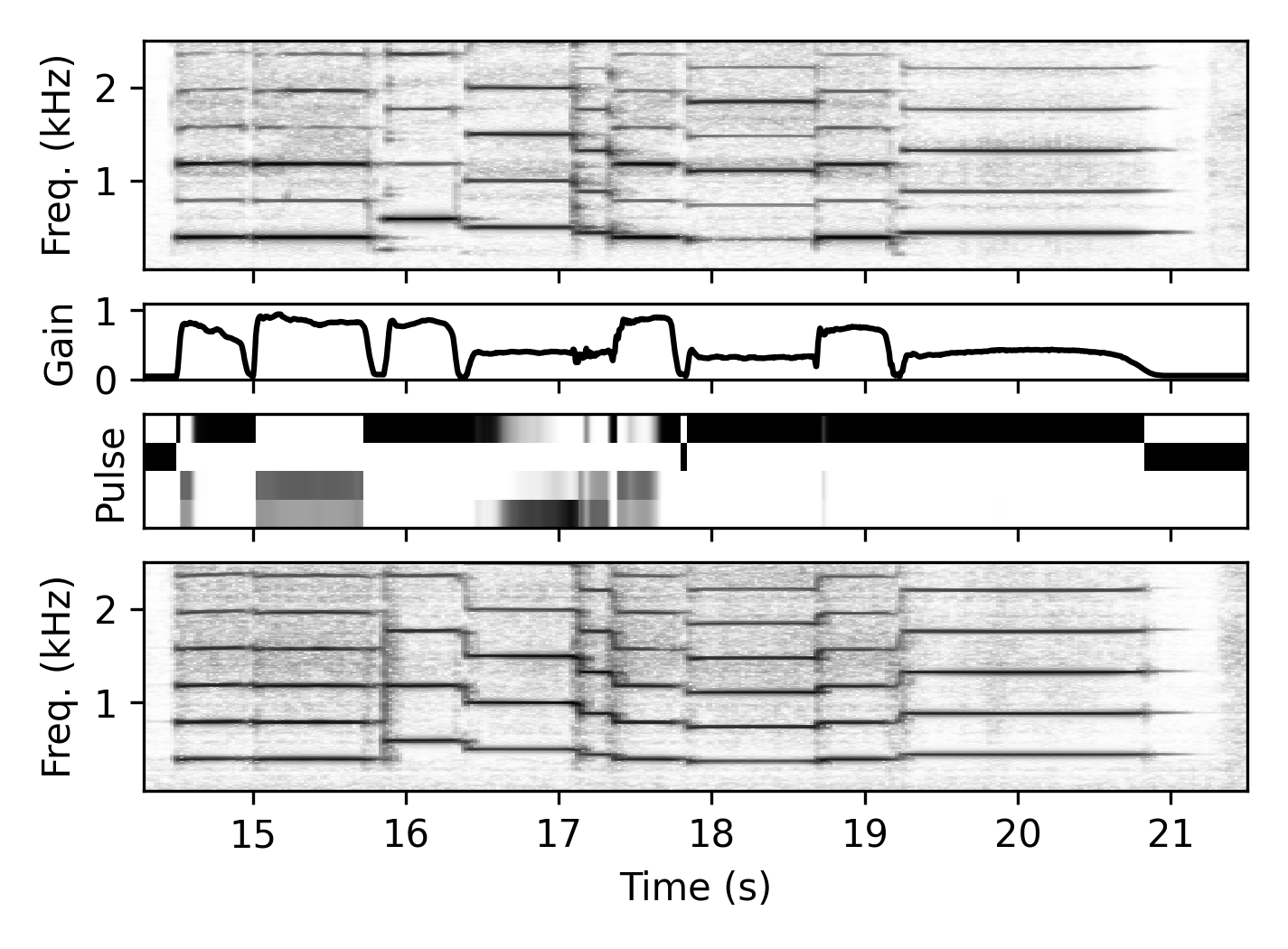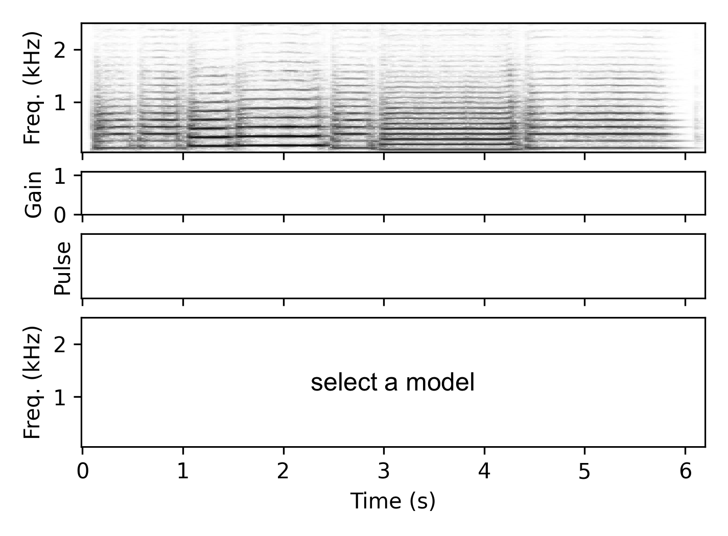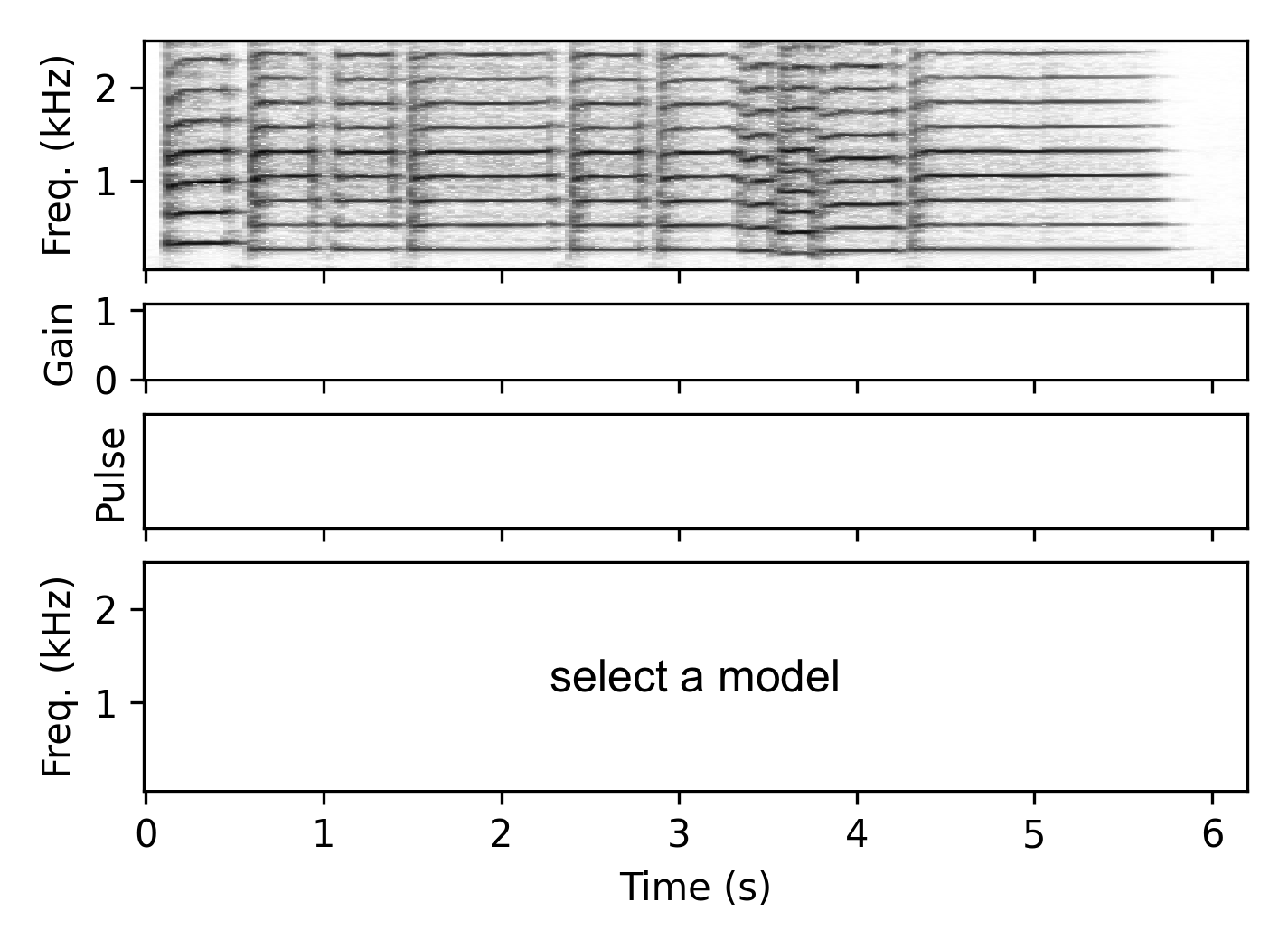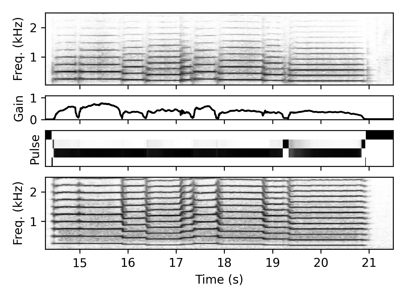 The gain estimator $\mathcal{G}$ receives a mel-spectrogram representation of the input signal and outputs a gain value $g_i$ for each time frame, which serves as the envelope for the harmonic component of the signal. In this way, the network not only estimates the overall signal envelope but also learns to ignore noisy or transient components.