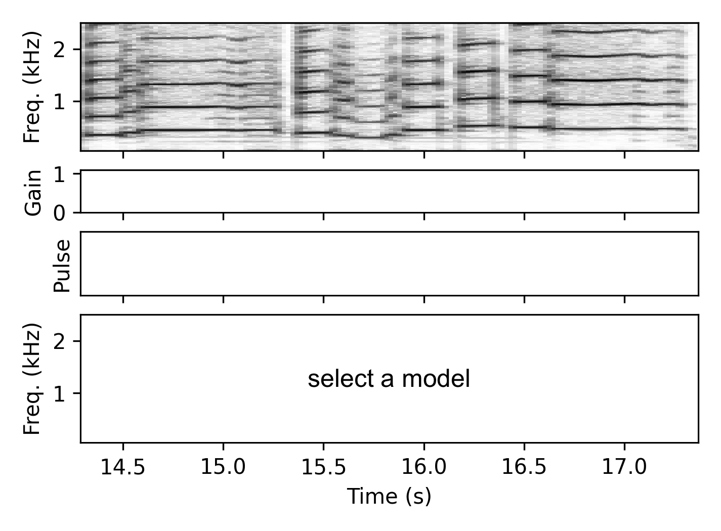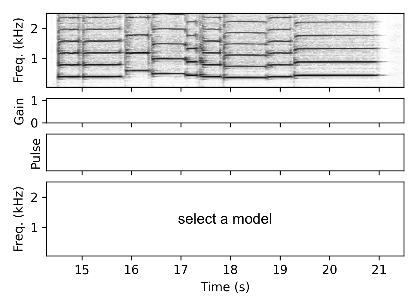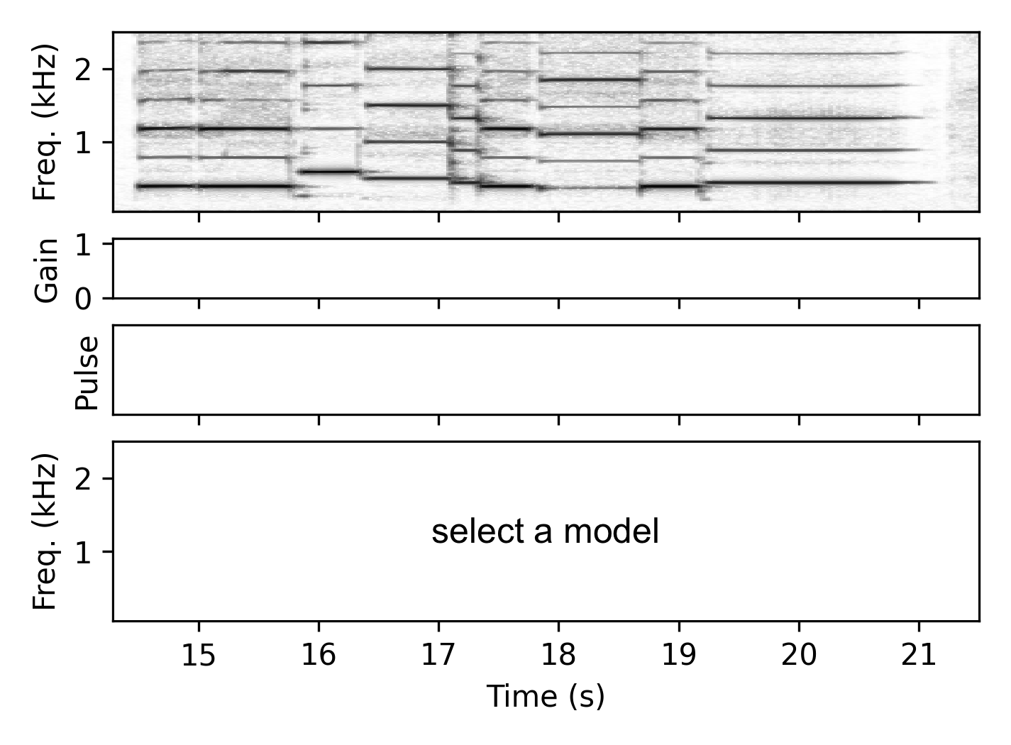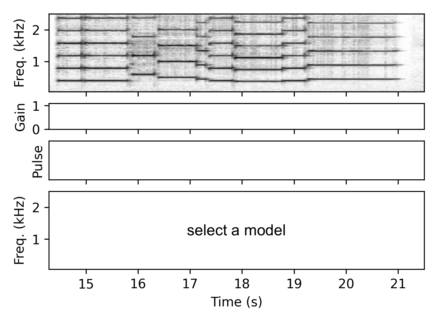 Both $f_i$ and $g_i$ are represented using smoothed logarithmic binned vectors $\hat{f}_i \in \mathbb{R}^{8}$ (covering 150–1500 Hz) and $\hat{g}_i \in \mathbb{R}^{8}$ (covering 0.001–1). These are concatenated and provided as input to a two-layer fully-connected network with a total of 1,012 trainable parameters. The output of the second layer $z_i \in \mathbb{R}^{M}$ is then transformed into the pulse selection weights $w_i = \sigma(z_i / \tau)$, where $\sigma$ is the softmax function and $\tau$ is a temperature parameter. Over the first 20 epochs, $\tau$ is gradually decreased from 1 to 0.01, corresponding to a Gumbel softmax with temperature annealing.