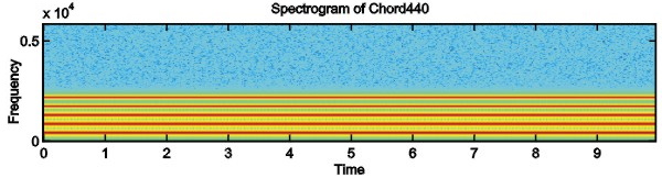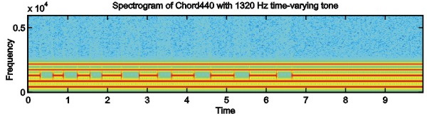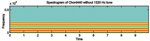 Consider the synthetic signal Chord 440 (Figure 1a) as the next example. It contains a fundamental "A" note (440 Hz) plus four harmonics. The five tones fuse together in a perfect octave consonance, that is, a single perceived stream.
