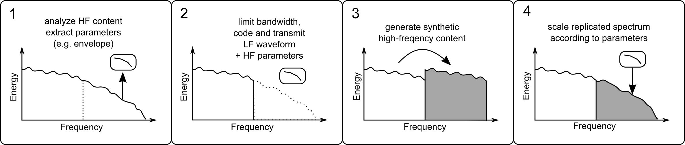 While the idea of bandwidth extension (BWE) had been explored for speech coding before, it has emerged for perceptual audio coding around the year 2000 and has proven to be an extremely useful coding approach that can provide high reproduced audio bandwidth also at very low bitrates. Where conventional audio codecs without BWE have to limit the transmitted audio bandwidth due to the limited number of available bits, BWE-enabled codecs add some compact side information to the bitstream that allows the decoder to synthesize a perceptually convincing high-frequency (HF) portion from the transmitted low-frequency (LF) part. In this way, full-bandwidth reconstruction can be achieved from a transmitted audio bandwidth as low as 4kHz. Like Perceptual Noise Substitution, bandwidth extension is an efficient coding method that is not waveform-preserving.