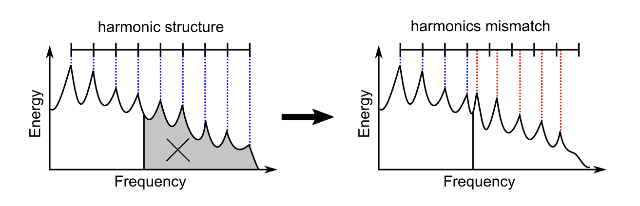 When both LF and HF part are rather tonal, but the harmonic structure of the reconstructed signal does not match the original signal, similar artifacts as for exaggerated tonality can occur. Moreover, tones that are placed too closely together near the crossover frequency can lead to modulation and beating artifacts. Figure 7 illustrates the spectrogram of a tonal, harmonic signal (accordion), where frequencies above 4kHz have been reconstructed by repeatedly copying up the LF part. Note how the overall tonality is still preserved in the HF part, but the pattern does not match the harmoic continuation of the LF part as seen in the original signal.