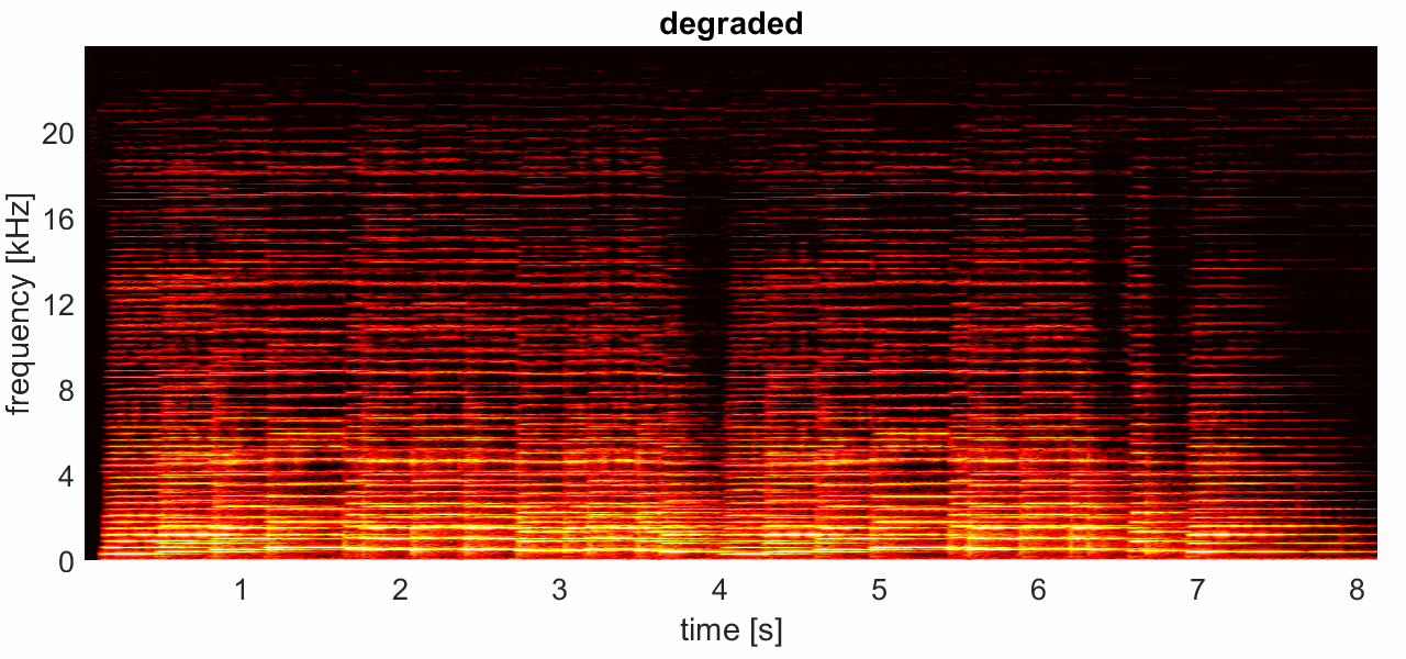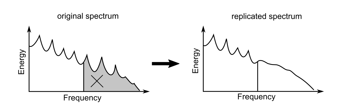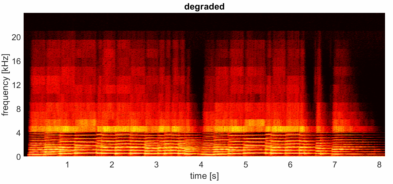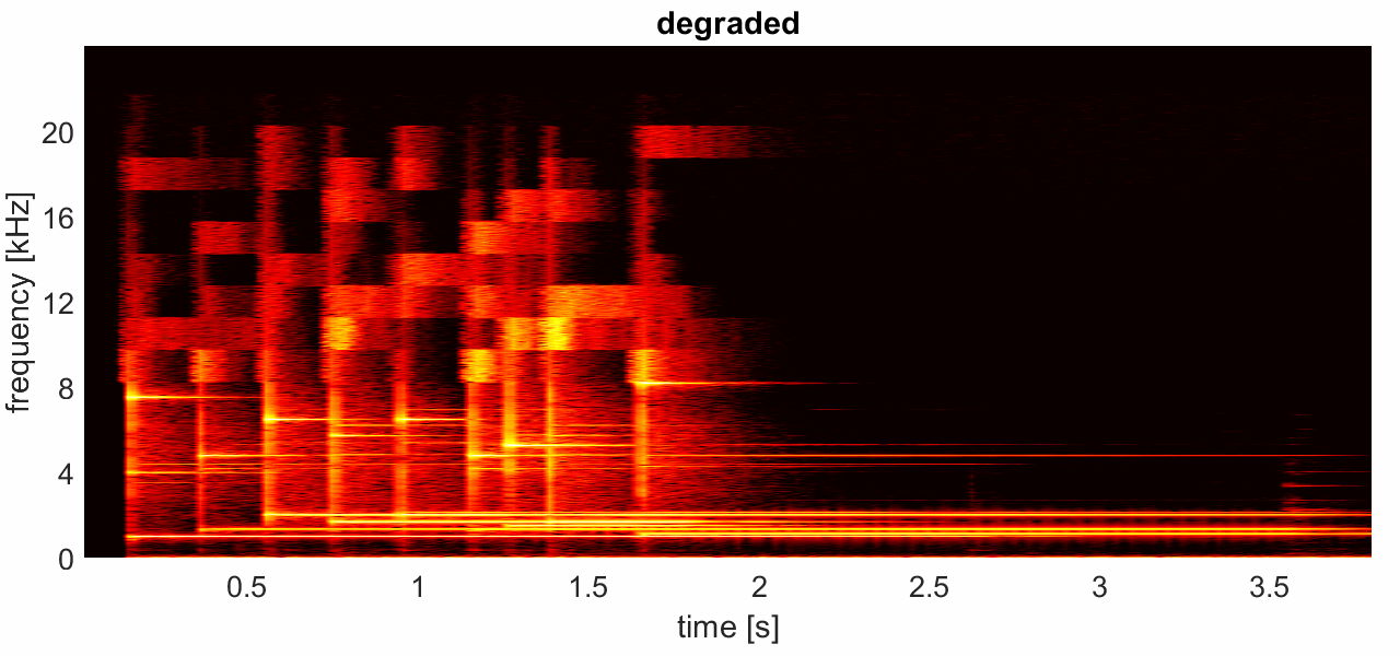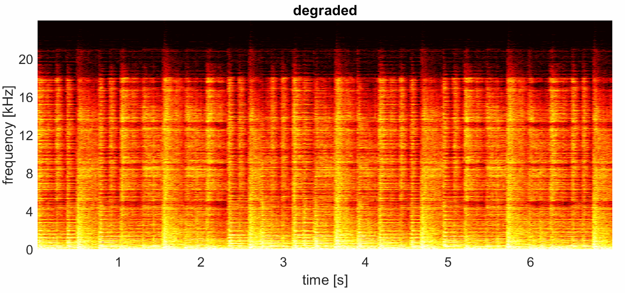 For the following sound examples, intentionally degraded signals were generated to simulate clearly audible artifacts to sensitize listeners to more subtle coder-induced artifacts of the same nature. To demonstrate noisiness, the HF spectrum is replaced by noise of the same spectral envelope. To demonstrate exaggerated tonality and harmonicity mismatch, the HF spectrum is replaced by a scaled version of the LF spectrum. Further details on the simulation of coding artifacts for demonstration and research purposes can be found in [6].