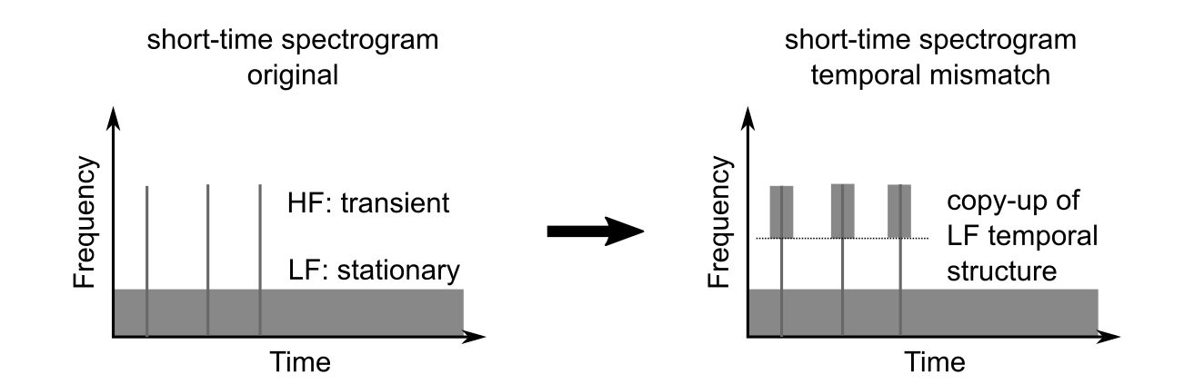 When the temporal shaping of the reconstructed signal does not match the original spectrum, pre-echo like artifacts can occur. Figure 9 illustrates the spectrogram of a transient signal (glockenspiel), where the frequencies above 4kHz have been substituted by noise, matching the average energy in frames of 21 ms length. Besides the loss of tonality, the sharp attacks are temporally smeared in the HF part, resembling pre-echos with a high-pass characteristic.