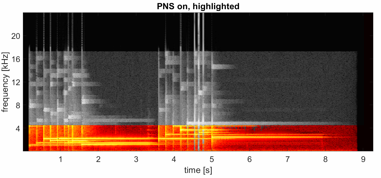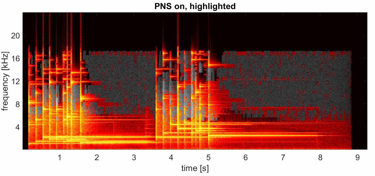 The following demonstration signals illustrate the types of artifacts that can result from improper use of PNS and how these artifacts can be avoided by using proper control mechanisms. They have been generated using an MPEG-4 AAC codec which runs at a bitrate of 128 kbit/s for a stereo signal, i.e. a comparably high bitrate to exclusively showcase PNS-related artifacts (rather than quality degradation due to low bitrate / coarse quantization).