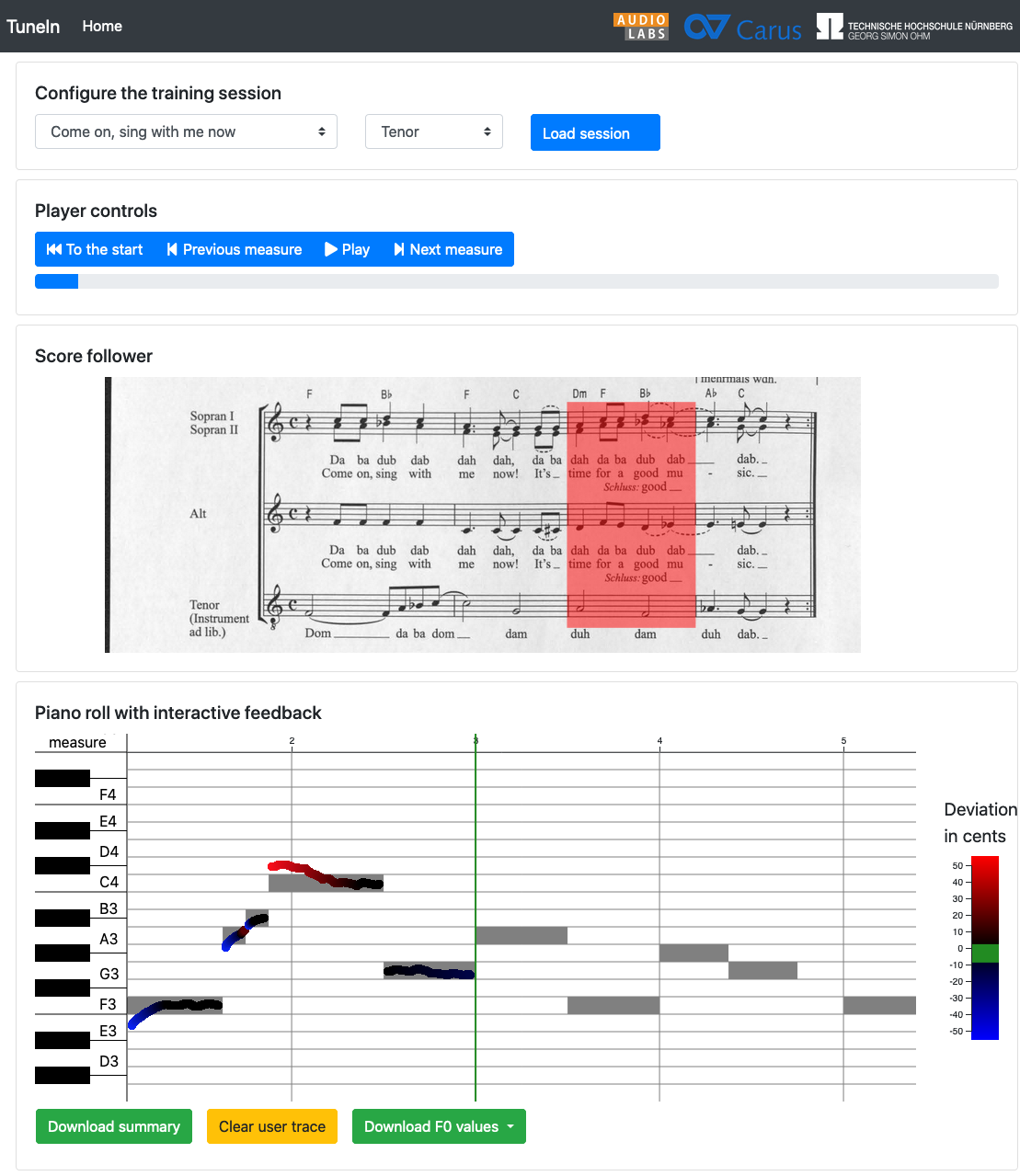 | Choir singers typically practice their choral parts individually in preparation for joint rehearsals. Over the last years, applications have become popular that support individual rehearsals, e.g., with sing-along and score-following functionalities. In this work, we present a web-based interface with real-time intonation feedback for choir rehearsal preparation. The interface combines several open-source tools that have been developed by the MIR community. | ![]() |