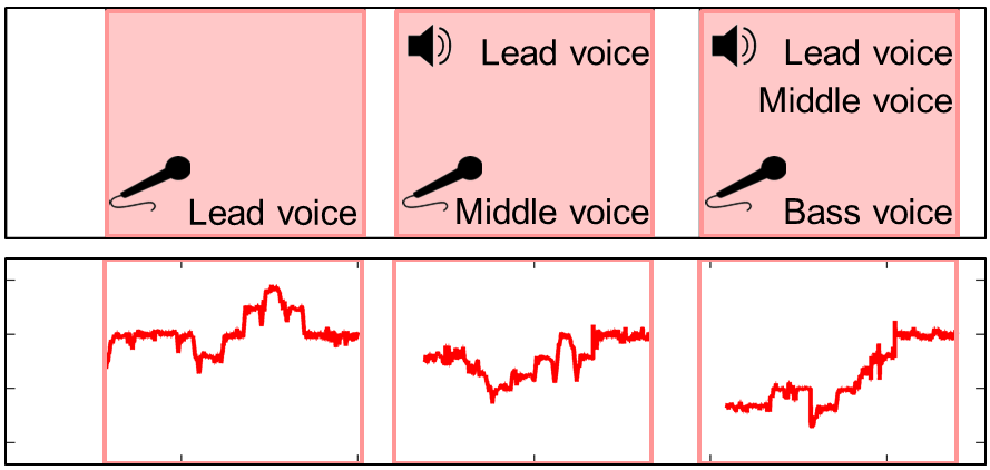 | Due to the complex nature of the human voice, the computational analysis of polyphonic vocal music recordings constitutes a challenging scenario. Development and evaluation of automated music processing methods often rely on multitrack recordings comprising one or several tracks per voice. However, recording singers separately is neither always possible, nor is it generally desirable. As a consequence, producing clean recordings of individual voices for computational analysis is problematic. In this context, one may use throat microphones which capture the vibrations of a singers’ throat, thus being robust to other surrounding acoustic sources. In this contribution, we sketch the potential of such microphones for music information retrieval tasks such as melody extraction. Furthermore, we report on first experiments conducted in the course of a recent project on computational ethnomusicology, where we use throat microphones to analyze traditional three-voice Georgian vocal music. | ![]() |