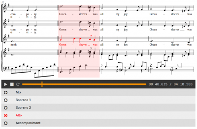 Music can be represented in many different ways. In particular, audio and sheet music renditions are of high importance in Western classical music. For choral music, a sheet music representation typically consists of several parts (for the individual singing voice sections) and possibly an accompaniment. Within a choir rehearsal scenario, there are various tasks that can be supported by techniques developed in music information retrieval (MIR). For example, it may be helpful for a singer if both, audio and sheet music modalities, are present synchronously—a well-known task that is known as score following. Furthermore, listening to individual parts of choral music can be very instructive for practicing. The listening experience can be enhanced by switching between the audio tracks of a suitable multi-track recording. In this contribution, we introduce a web-based interface that integrates score-following and track-switching functionalities, build upon already existing web technology.