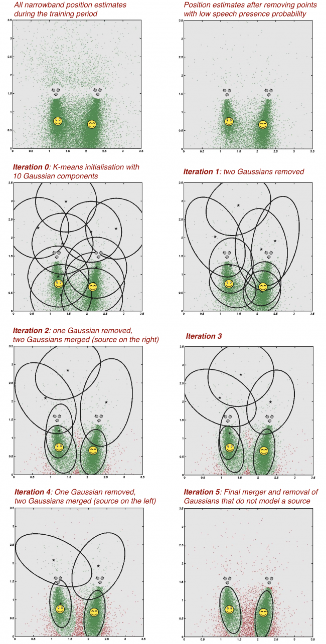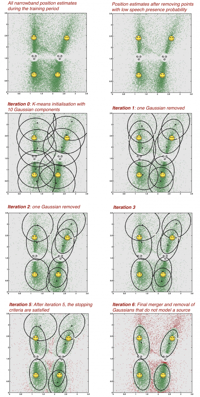 In the examples below first you can listen to the audio signal which was used to localize the sources and cluster the narrowband position estimates. We refer to this as the training period. Then the iterations of the EM algorithm and the learned clusters are illustrated. Finally, you can listen to the separated source signals.