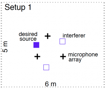 Room size: 6 m x 5 m x 3 m. Three uniform circular arrays were used with diameter 2.5 cm and with three microphones each. Further details about the setup and implementation can be found in the paper.
