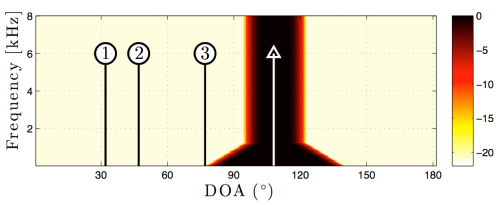 This experiment was conducted with RT60 = 0.36 s, with the desired speaker placed at 107 degrees, 2m away from the microphone array. The interfering speaker was subsequently active from positions 1 to 3, as shown in the figure.