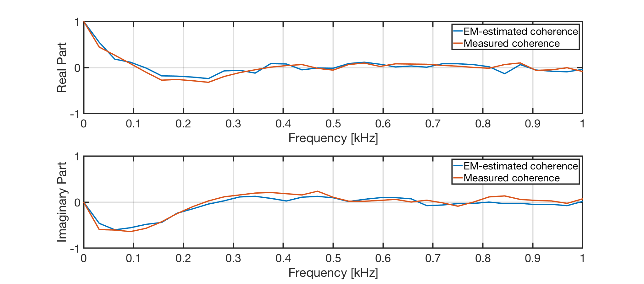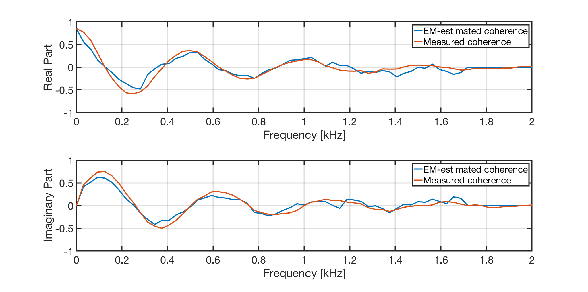 Following, the comparison between the spatial coherence measured from one microphone pair (in red) and the spatial coherence estimated exploiting the proposed method (in blue) from the example above