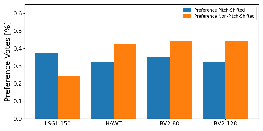 Here we provide additional evaluation for the listening test results. For the main results, please check the paper. In the following plot, we aggregate the number of decided preference votes of our AB listening test into the groups "Preference Pitch-Shifted" and "Preference Non-Pitch-Shifted" for each vocoder. We can see that for all neural models, listener's indicate a slight preference towards the non-shifted items. This suggests that pitch-shifting has a slight negative influence on the quality of the output for the neural vocoder models, irrespective of tuning.