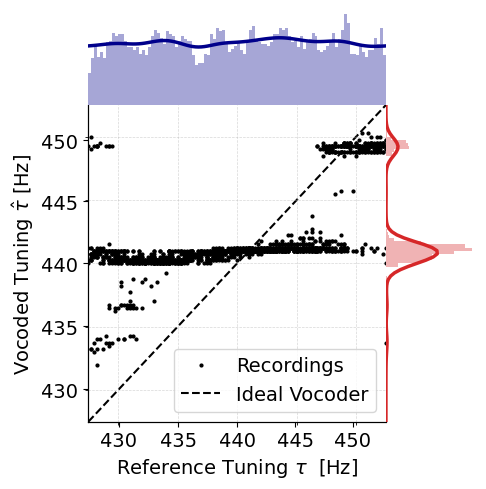 We provide the scatter plots of input vs. output tuning for all vocoders and datasets with both tuning estimators: TempMatch (libfmp) tuning estimator and FreqHist (librosa) tuning estimator.