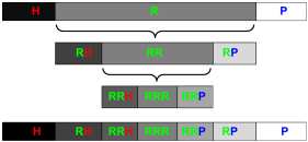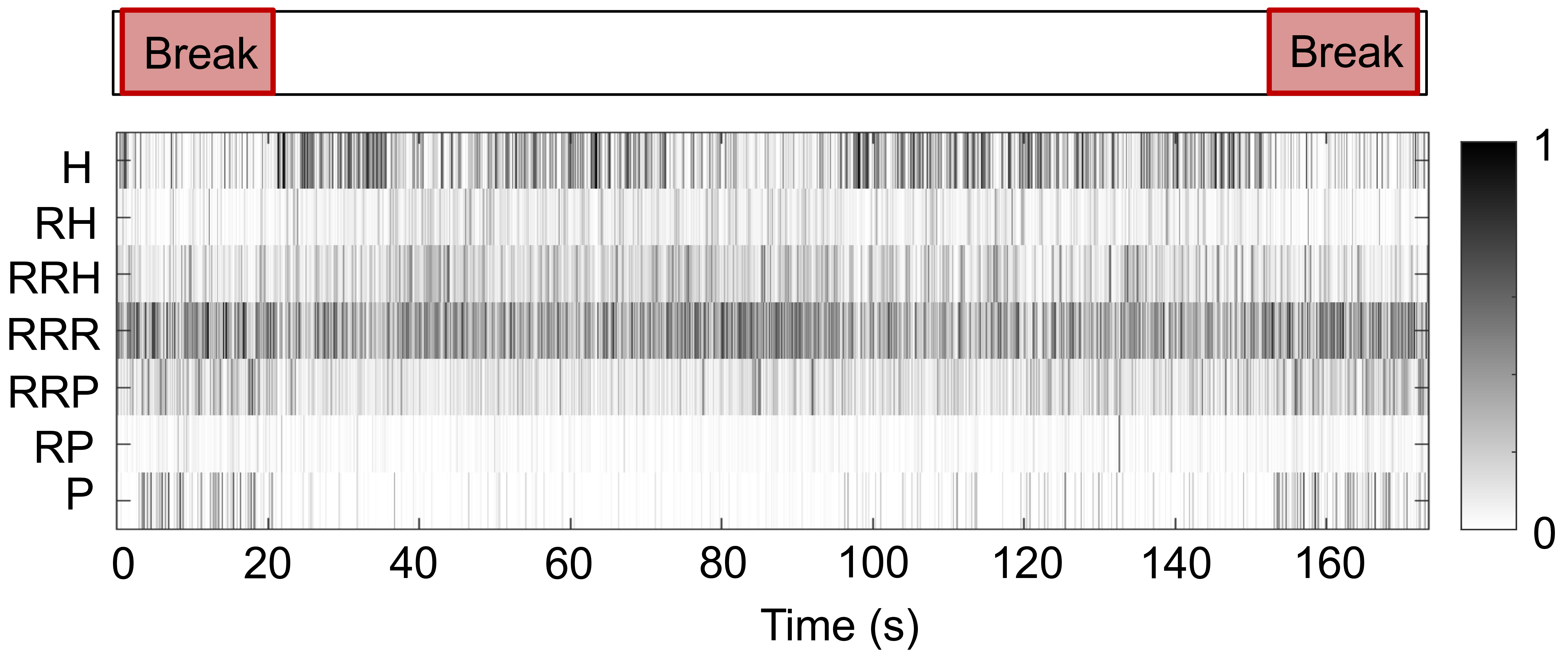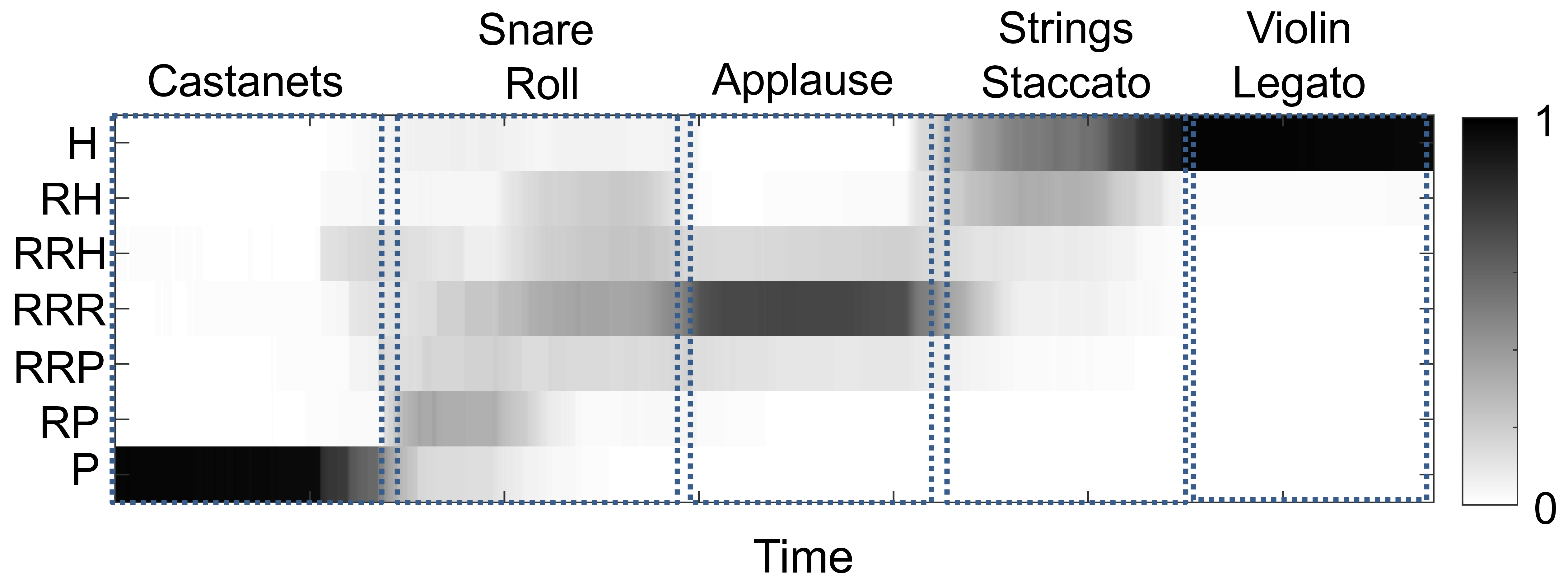 This figure contains the CHRP feature matrix for a signal consisting of five non-overlapping sound samples: castanets, snare roll, applause, staccato strings and legato violin. The castanets have the highest percussive energy and are well confined to the P component. The snare roll is predominantly composed of RP and RRR. Indeed, snare drums have a percussive attack and a decay curve which is both noisy and tonal (according to the drum's tuning frequency). When struck in rapid succession, the noisy decay tails overpower the percussive onsets. Applause is centered around RRR and well-confined to the residual region. The staccato strings are predominantly harmonic, with an additional RH component which corresponds to the noisy attacks that emerge in this playing technique. Violin legato is confined to the H component, since the stable, harmonic signal properties dominate all other components.