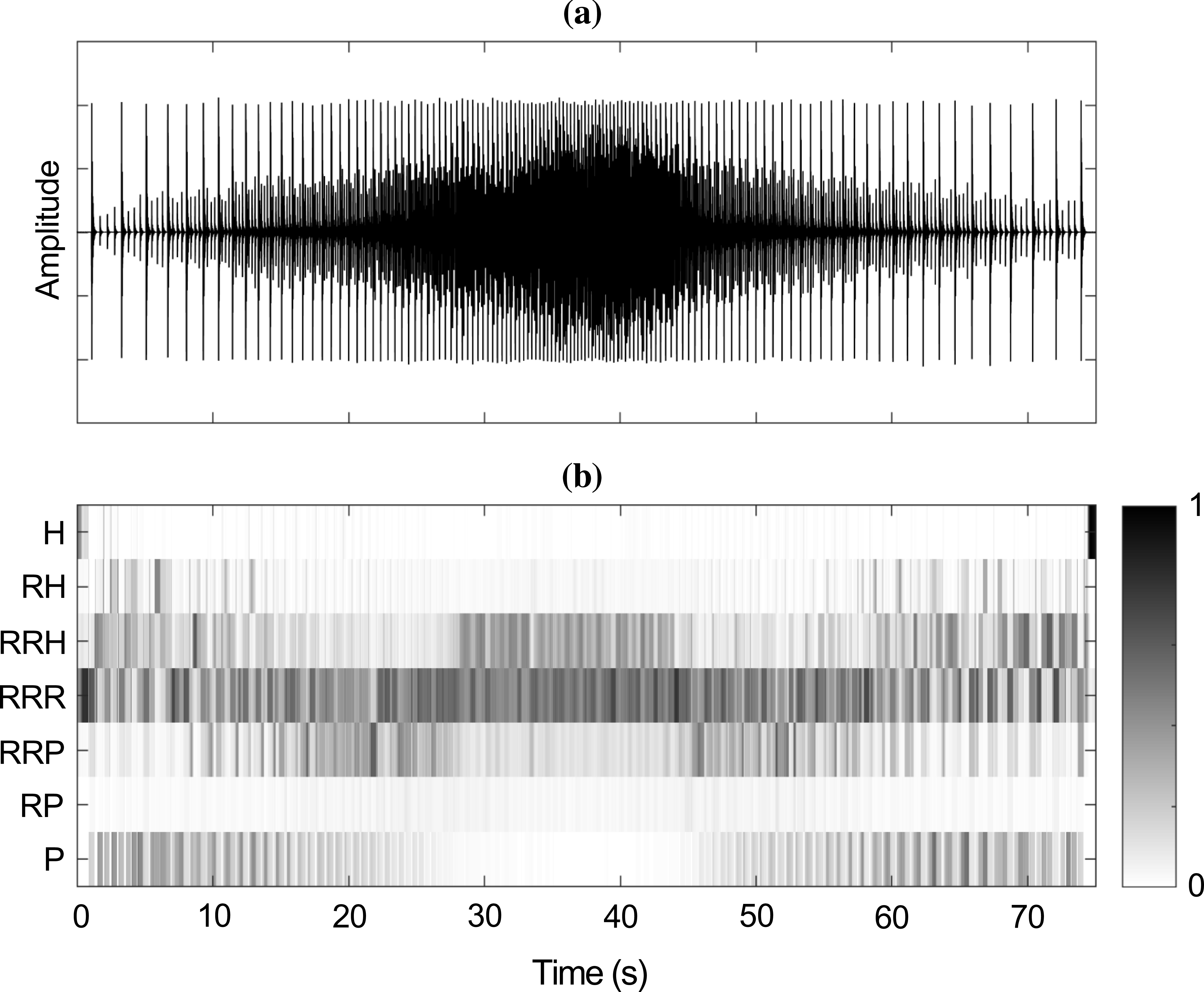 Our first example shows energy migrating from percussive to residual in a snare-playing technique known as paradiddles}. Figure (a) shows the waveform of paradiddles played on a snare drum; first with increasing speed (0--40 sec), and then with decreasing speed (40--75 sec). Figure (b) contains the corresponding CHRP feature matrix; notice how there is very little remaining P energy after a certain onset frequency or playing speed has been reached (around 25 sec). This is due to the fact that the noise-like tails reach a relative proximity and overpower the individual percussive onsets, centering the energy around the residual components in the feature matrix.