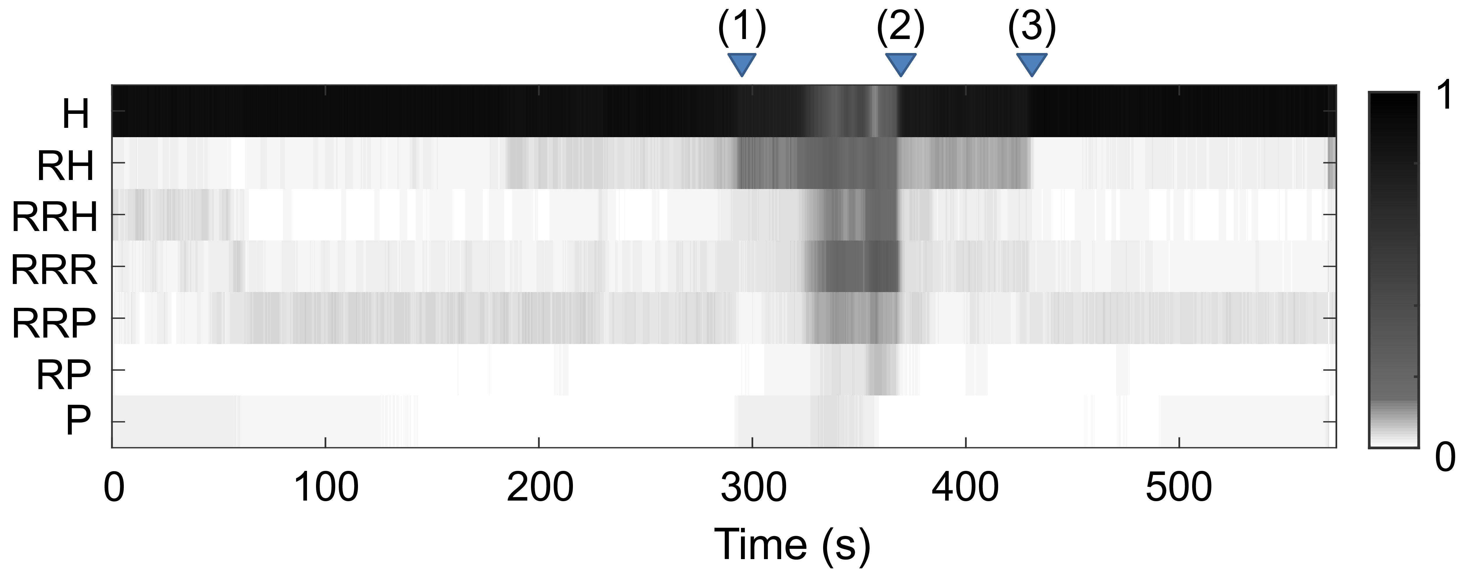 We show CHRP for Nicole Moudaber's track Liberum Spirita (Original Mix) YouTube Link. The audio offered here contains four bars before and after each of the three annotated points. (1) [4:53] indicates the removal of the bass drum and the beginning of a section dominated by cymbal sounds and an increasing level of noise-like components (notice the increase in all R components and the decrease in the H component); (2) [6:08] indicates the reintroduction of the bass drum. The region between (2) and (3) contains an articulative sound in the form of a noise burst. Timepoint (3) also marks the removal of a long-tailed ride cymbal sound, which can be seen as a drop in RRR energy. The decrease in RH energy at (3) is primarily due to the removal of a synthesizer sound consisting of both tonal and noise-like components.