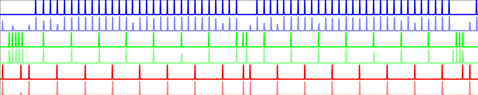 This is an excerpt (from 00:18 to 00:37 mm:ss) of the item 144_MIDI-minus-one_rock-113_sticks.wav from the ENST-Drums dataset. The activation functions in red, green and blue represent the ground truth drum onsets, the activations in light red, light green, and light blue represent the output of the respective algorithms.