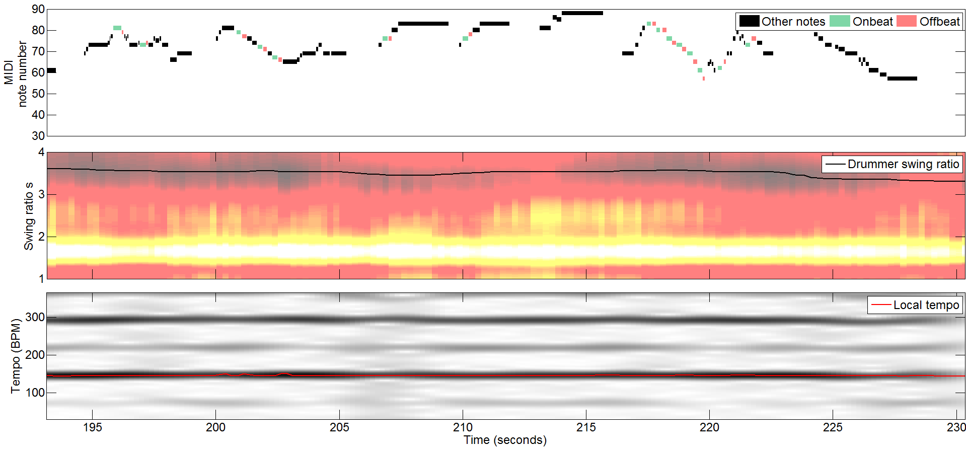 In the figures above, we show the piano-roll, swingogram, and tempogram of a solo section from the 1961 recording of "Down Under," with solo trumpet player Freddie Hubbard playing together with drummer and bandleader Art Blakey. At an average tempo of around 146 BPM, the ride cymbal swing ratio exhibits a slightly wavy variation around 3.5. In constrast, Hubbard stays at the other end of the swing-ratio range and plays his onbeat onsets in a laid-back fashion behind the beat. His offbeats, however, synchronize very well to Blakey's offbeats most of the time as hypothesized by Friberg [5].