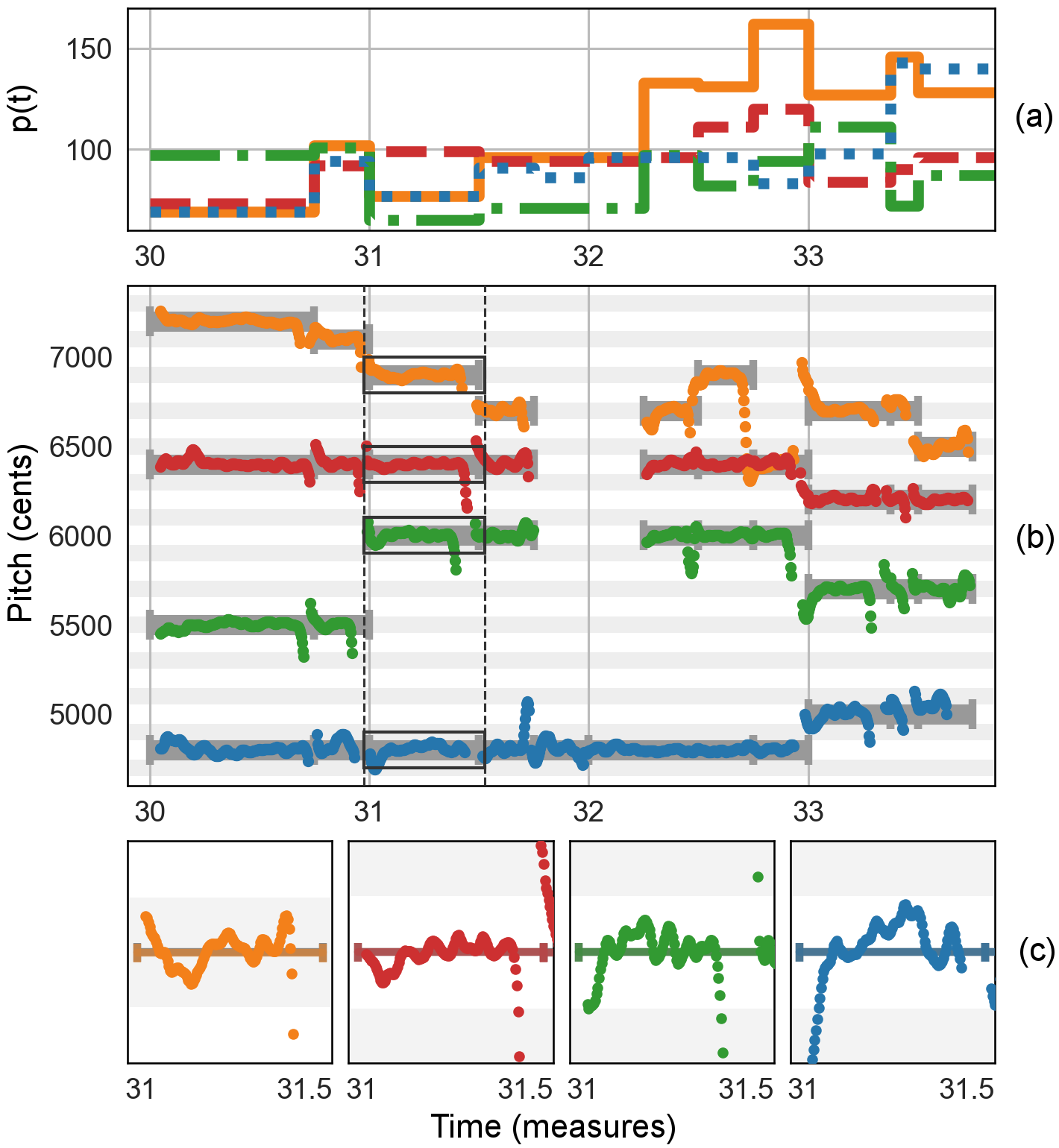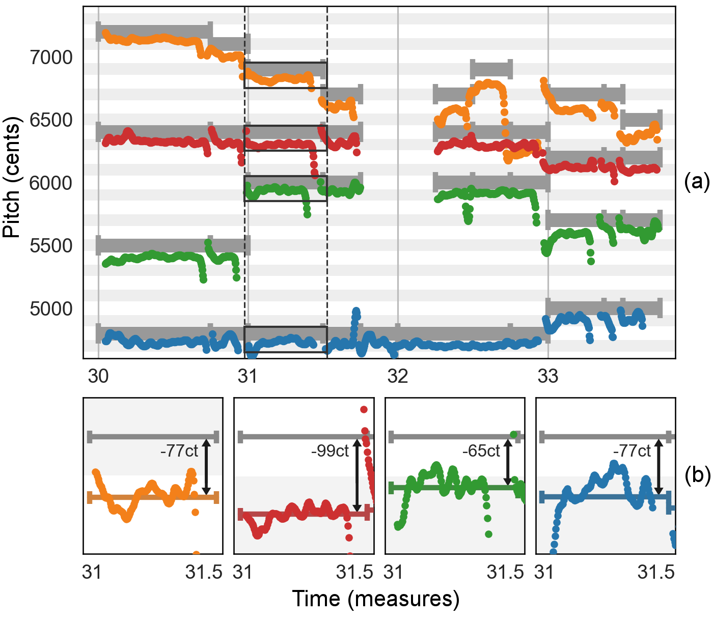 | A central challenge for a cappella singers is to adjust their intonation and to stay in tune relative to their fellow singers. During editing of a cappella recordings, one may want to adjust local intonation of individual singers or account for global intonation drifts over time. This requires applying a time-varying pitch-shift to the audio recording, which we refer to as adaptive pitch-shifting. In this context, existing (semi-)automatic approaches are either labor intensive or face technical and musical limitations. In this work, we present automatic methods and tools for adaptive pitch-shifting with applications to intonation adjustment in a cappella recordings. To this end, we show how to incorporate time-varying information into existing pitch-shifting algorithms that are based on resampling and time-scale modification (TSM). Furthermore, we release an open-source Python toolbox, which includes a variety of TSM algorithms and an implementation of our method. Finally, we show the potential of our tools by two case studies on global and local intonation adjustment in a cappella recordings using a publicly available multitrack dataset of amateur choral singing. | ![]() |