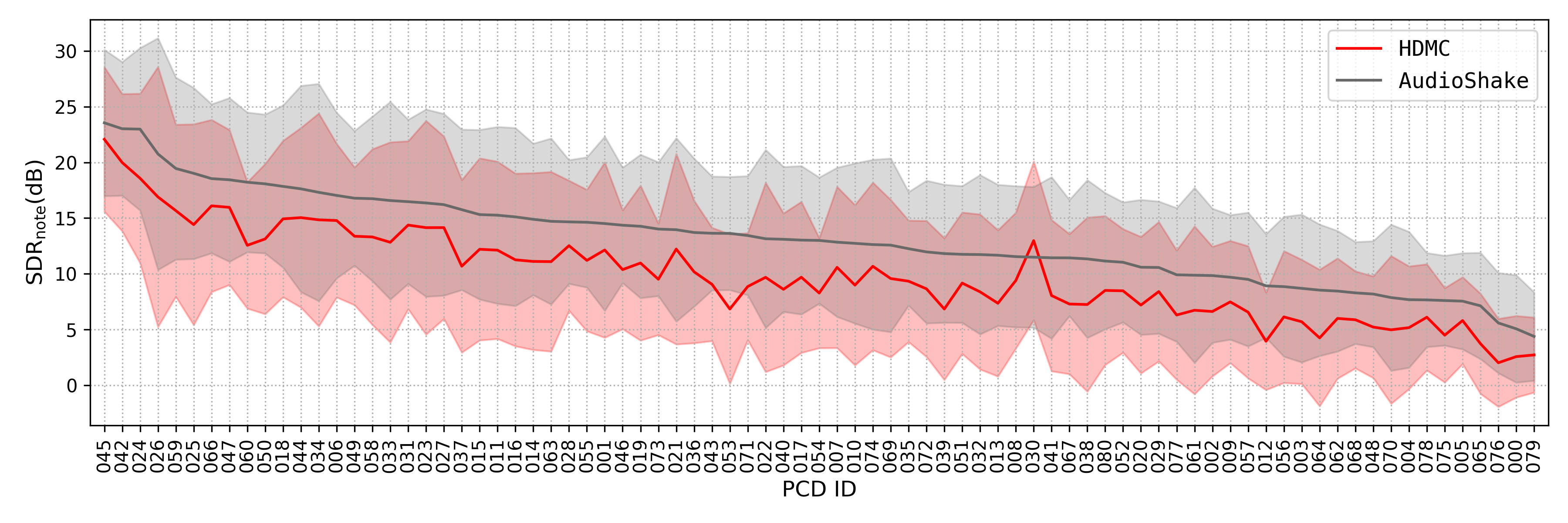 As illustrated in the figure, this subset comprises the top five best-separated examples (PCD IDs: 045, 042, 024, 026, 059), the top five worst-separated examples (PCD IDs: 079, 000, 076, 065, 005), and two averagely separated examples (PCD IDs: 022, 040) by HDMC and AudioShake, based on the resulting SDR scores.