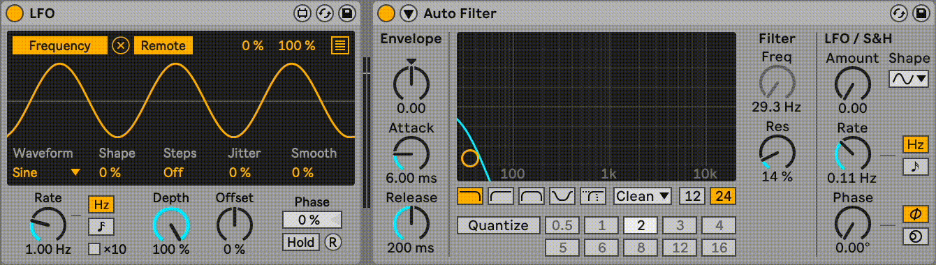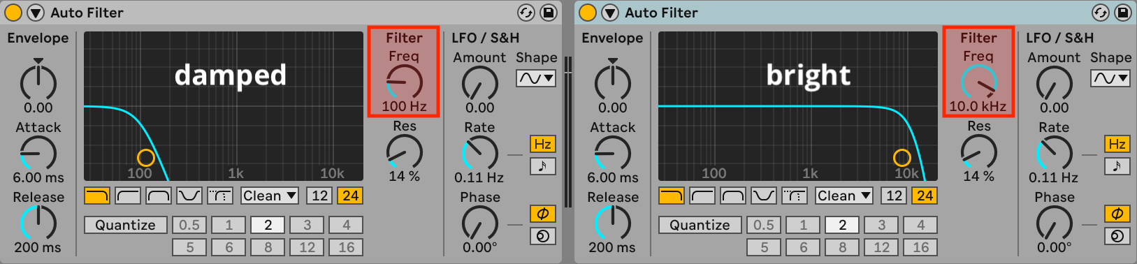 In this example, we modulate the cut-off frequency of a low-pass filter to automatically shape the sound of instruments, like a Bass or a Piano, in a rhythmically interesting way. To this end, we use a simple Kick drum pattern as the input signal for generating our control signals. Applying a low-pass filter to an instrument can change its sound depending on the chosen cut-off frequency setting, altering it from a damped sound at lower filter frequencies to a bright sound at higher filter frequencies, as depicted in Figure 1.