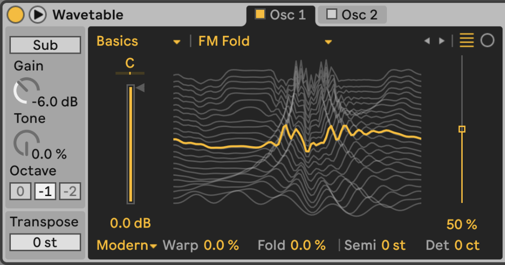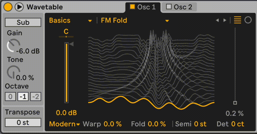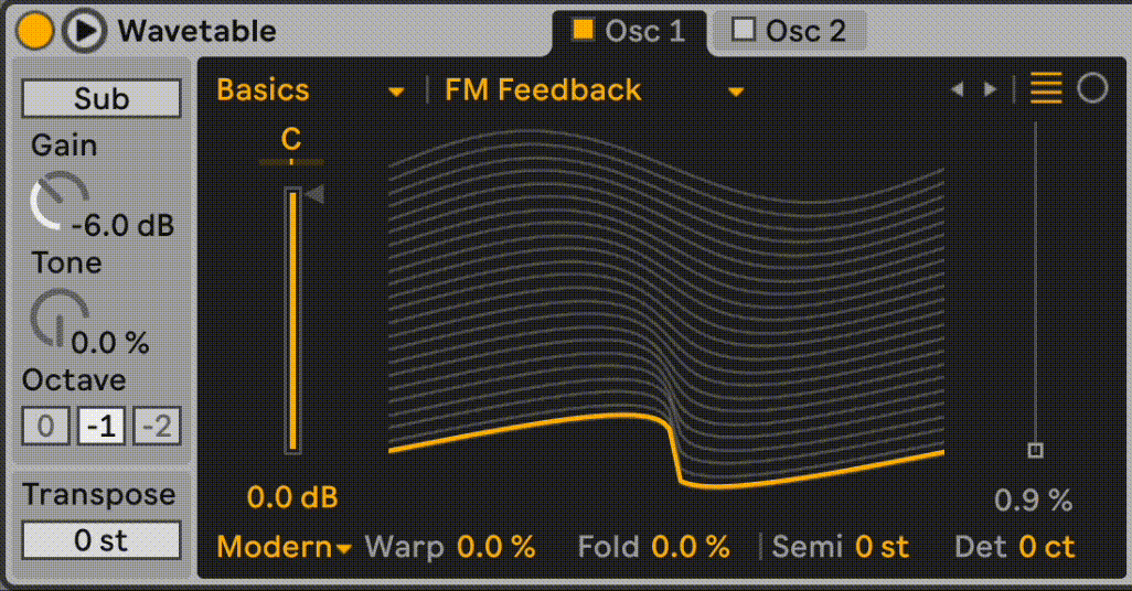 This wavetable changes the timbre and the pitch of the sound at the same time. The bottom position (0%) of the wavetable produces a clean sine wave sound with lower pitch, while the top position (100%) of the wavetable produces a more edgy sound with higher pitch and lots of overtones.