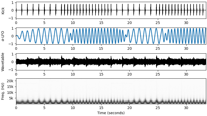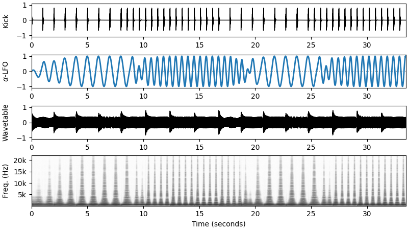 The position of a wavetable synthesizer is again a perfect candidate for modulation with control signals, like the alpha-LFO. For the following audio examples, we map alpha-LFO values of -1 to the 0% position of the wavetable and alpha-LFO values of 1 to the 100% position of the wavetable.