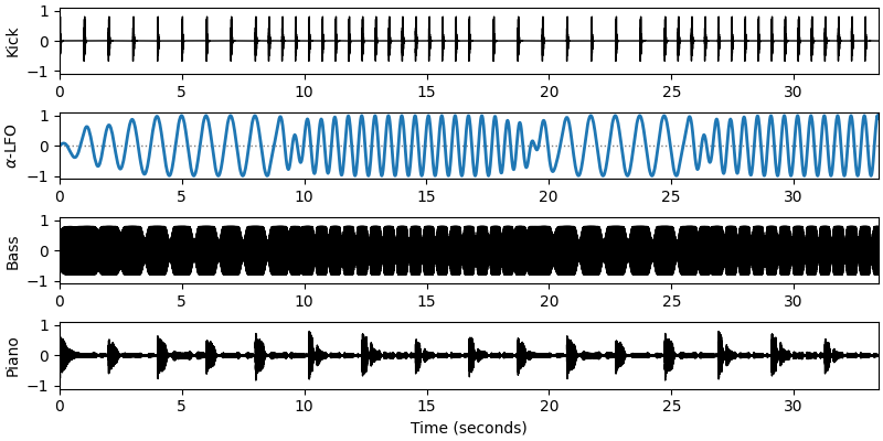 Listen to the Kick (input signal) in combination with the alpha-LFO modulated Bass and Piano tracks, or select individual tracks. Notice how the sound of the instruments changes from more damped to brighter tones, following the alpha-LFO curve.
