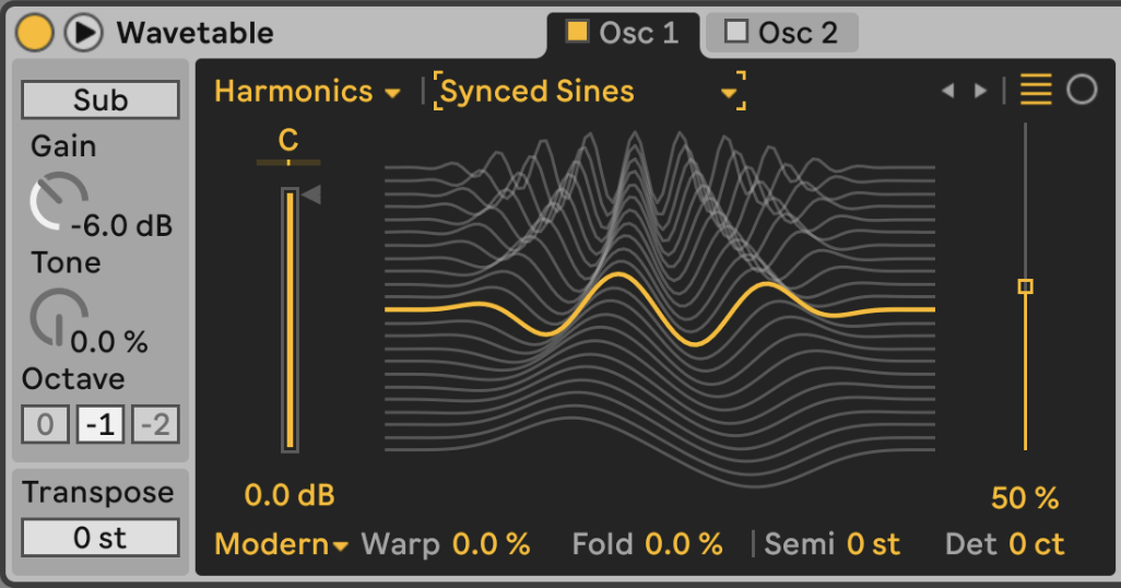 This wavetable changes the timbre of the sound while the pitch stays the same. The bottom position (0%) of the wavetable produces a sawtooth-like sound, while the top position (100%) of the wavetable produces a clean sinusoidal sound.