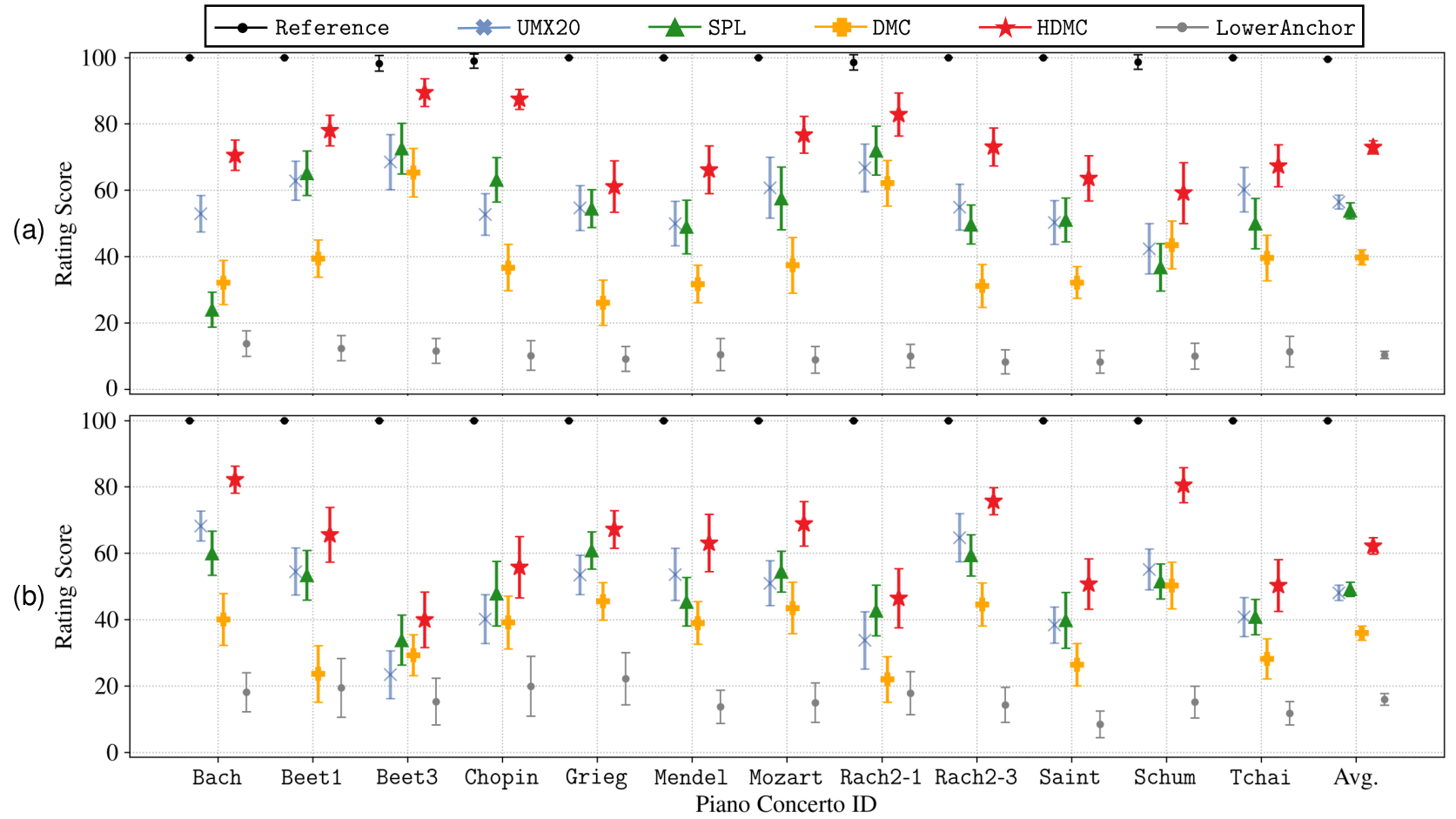 For assessing the quantitative and subjective evaluation of our experiments, we use the dry recordings without artificial reverberation from the Piano Concerto Dataset (PCD) as our test dataset, which contains 81 excerpts with separate piano and orchestral tracks, performed by five pianists.