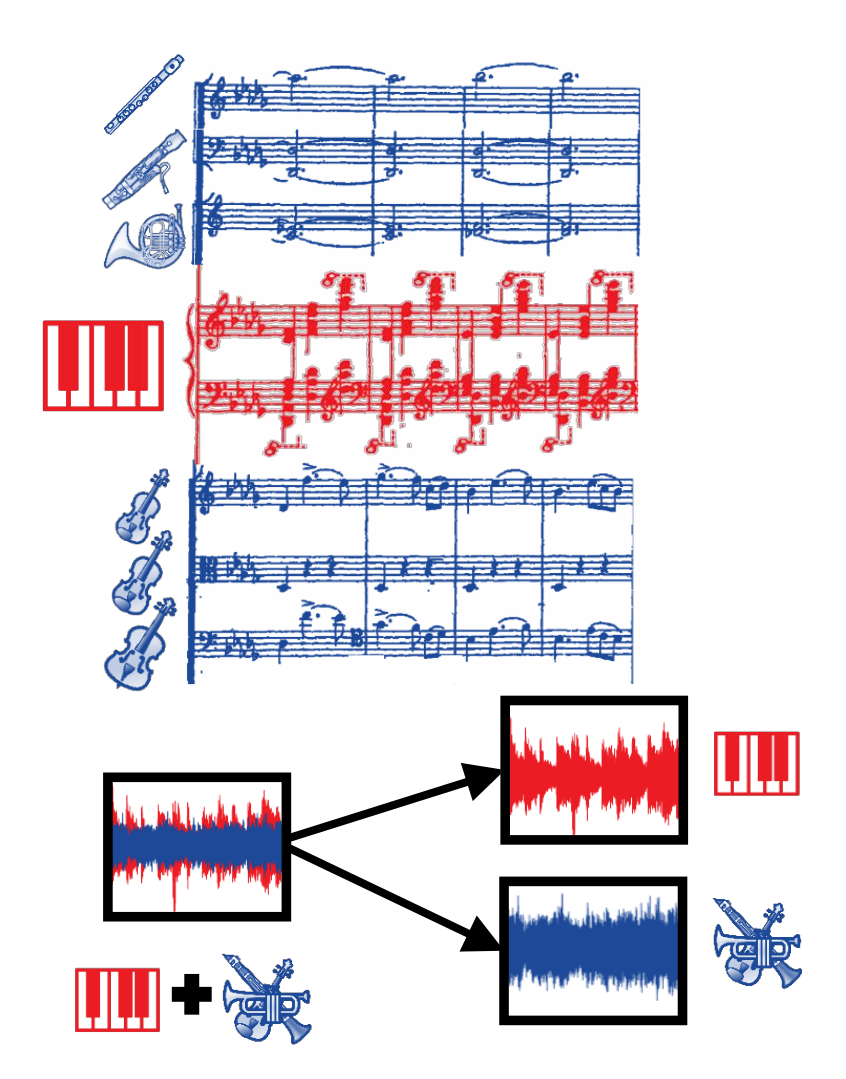 | In this work, we address the novel and rarely considered source separation task of decomposing piano concerto recordings into separate piano and orchestral tracks. Being a genre written for a pianist typically accompanied by an ensemble or orchestra, piano concertos often involve an intricate interplay of the piano and the entire orchestra, leading to high spectro–temporal correlations between the constituent instruments. Moreover, in the case of piano concertos, the lack of multi-track data for training constitutes another challenge in view of data-driven source separation approaches. As a basis for our work, we adapt existing deep learning (DL) techniques, mainly used for the separation of popular music recordings. In particular, we investigate spectrogram- and waveform-based approaches as well as hybrid models operating in both spectrogram and waveform domains. As a main contribution, we introduce a musically motivated data augmentation approach for training based on artificially generated samples. Furthermore, we systematically investigate the effects of various augmentation techniques for DL-based models. For our experiments, we use a recently published, open-source dataset of multi-track piano concerto recordings. Our main findings demonstrate that the best source separation performance is achieved by a hybrid model when combining all augmentation techniques. | ![]() |