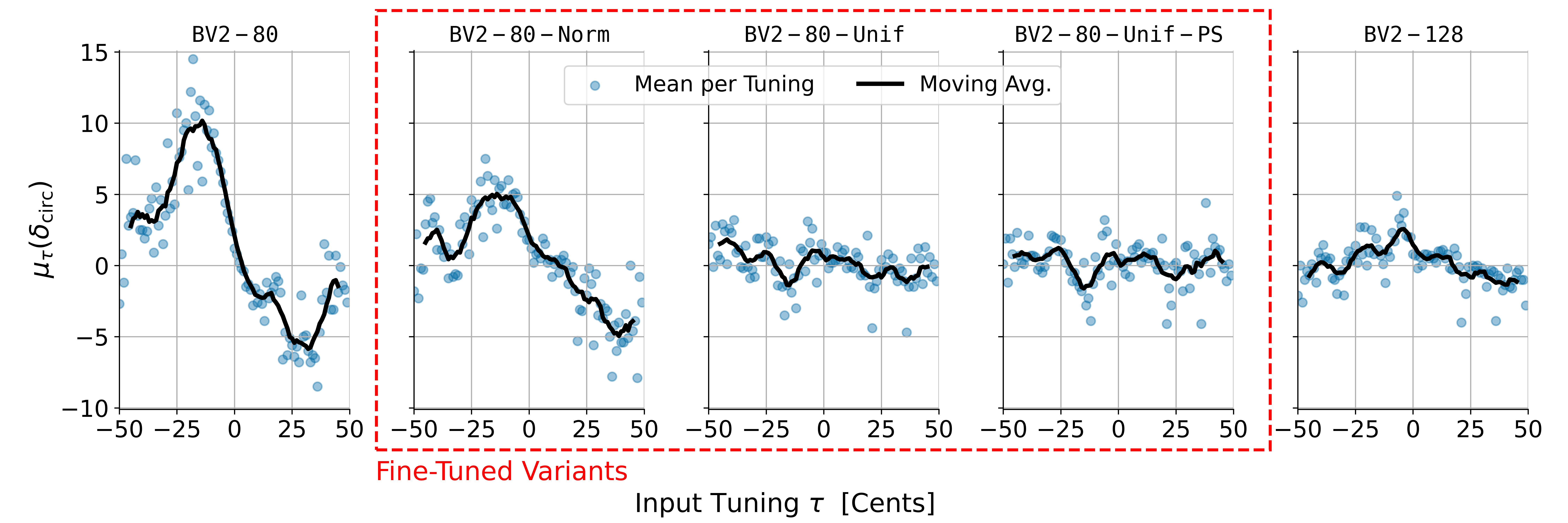 | Recent work has shown that neural vocoders can be prone to musical tuning bias, shifting the pitch reference of input signals, and reducing audio quality in cases of non-standard tuning. In this work, we investigate methods to mitigate this issue by fine-tuning, using the popular BigVGAN-V2 vocoder as a case study. Our goal is to make the vocoder reliable across a wide range of tunings and to examine whether reducing tuning bias also leads to more consistent audio quality. To this end, we explore two training approaches: one based on recordings with natural tuning variation, and another using data created through pitch-shift augmentation to replicate tuning diversity. The results demonstrate that targeted adaptation of BigVGAN-V2 mitigates tuning bias and improves audio quality for signals with non-standard tuning. In particular, our fine-tuned model with 80 mel bands matches the tuning preservation of the higher-resolution 128-band version, providing an efficient and robust solution for music synthesis across diverse tuning conditions. |