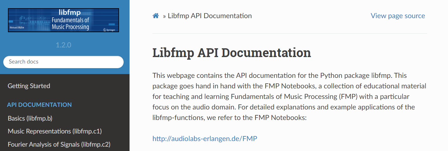 The content of the folder docs contains sources for the libfmp API documentation, which is based on the documentation generation package sphinx. An HTML export of this documentation, is available at: