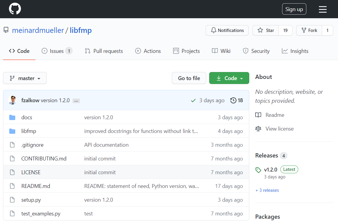 libfmp at GitHub¶The Python package libfmp is also provided at GitHub, which is a code hosting platform for the free and open source distributed version control system Git. The packages libfmp is exported from the FMP notebooks in a fully automatic process and then pushed to the following GitHub repository: