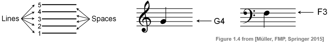 The standard Western music notation is based on a staff, which is a set of five horizontal lines and four spaces each representing a different musical pitch. A staff generally begins with a clef symbol, which indicates the position of one particular note on the staff and serves as a reference in relation to which the meaning of the notes positioned on any line or space of the staff can be determined. There are various clef symbols and clef positions. As an example, the following figure shows the G-clef (indicating that the second line is the pitch G4) and the F-clef (indicating that the fourth line is the pitch F3).