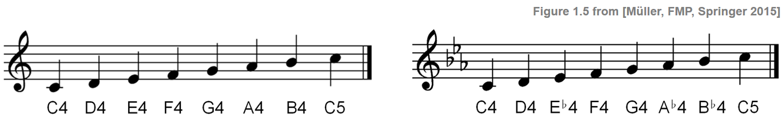 Following the clef, the key signature indicates the key of the piece by specifying that certain notes are flat or sharp throughout the piece, unless otherwise specified. For example, the notes shown on the left of the following figure form a C-major scale. Using the key signature consisting of three flats the notes E4, A4, and B4 are lowered to become E$^\flat$4, A$^\flat$4, and B$^\flat$4. The resulting scale is a (natural) C-minor scale.