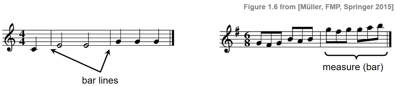 Music is typically organized into temporal units, referred to as beat. Repeating sequences of stressed and unstressed beats, in turn, form higher temporal patterns, which are related to what is called the rhythm of music and is expressed in terms of the musical meter. A measure or bar is a segment of time defined by a given number of beats. Dividing music into measures not only reflects its rhythmic nature, but also provides regular reference points within it. The following figure shows two examples on how to notate a time signature. Left: Four quarter notes per measure with upbeat. Right: Six eighth notes per measure.
