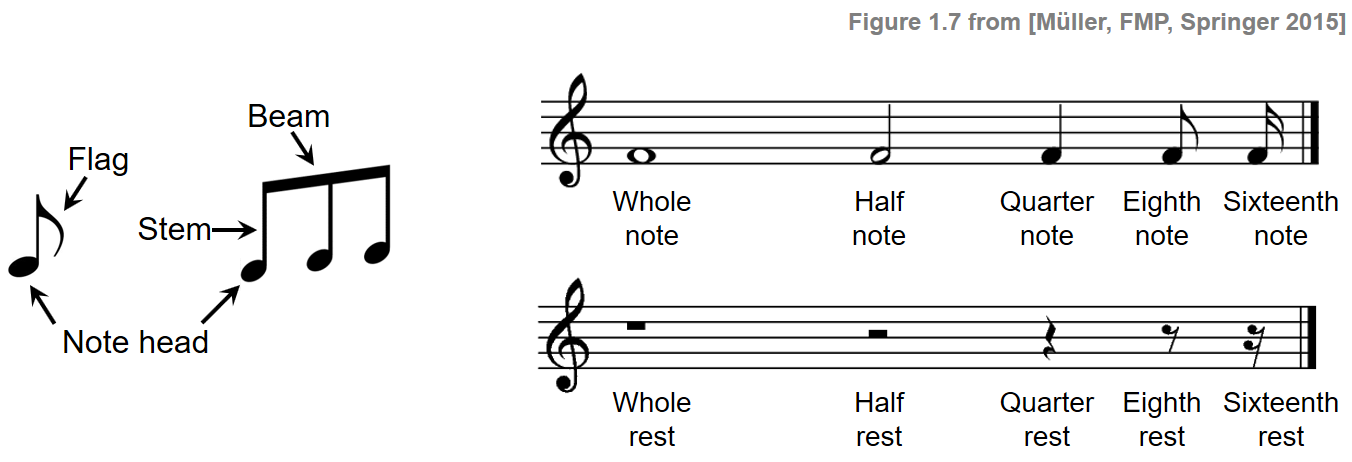 Generally speaking, music notation refers to a system for graphically representing music through symbols. The following figures illustrate some elements that are used in Western music notation.