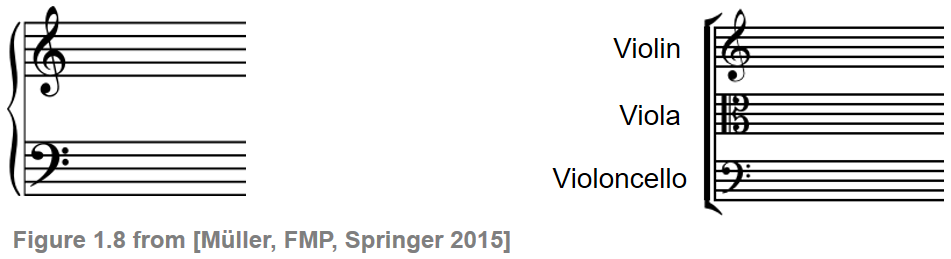 To notate music that is either played on a piano or is jointly played by different musicians on various instruments, one often uses several staves to notate the various musical voices. A single vertical line drawn to the left of multiple staves creates a staff system, which indicates that the music on all the staves is to be played simultaneously. A bracket is an additional vertically aligned symbol joining staves. This symbol shows groupings of instruments that function as a unit, such as the string section of an orchestra. The following figure shows a staff system (grand staff) as used for piano and a staff system as used for strings.