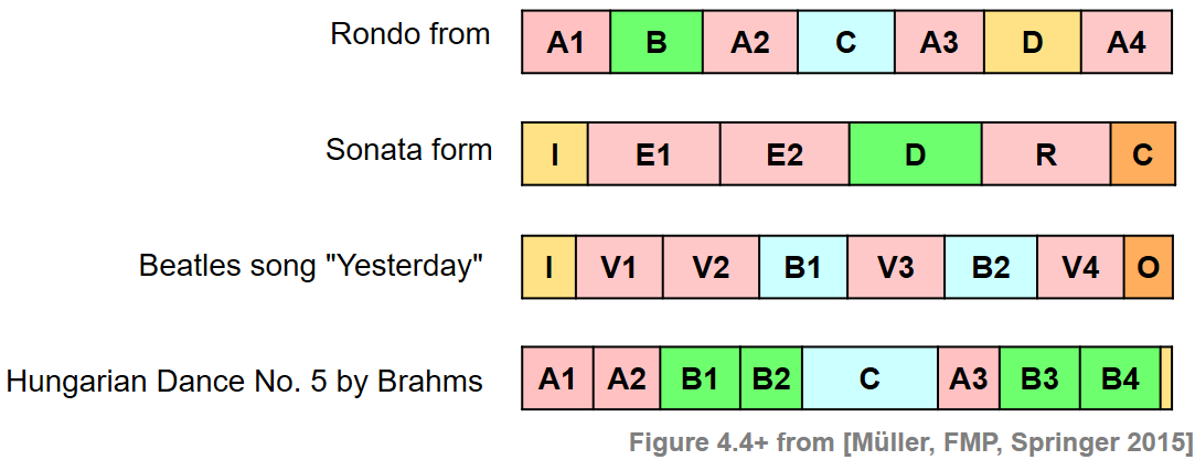 Often sections such as the chorus or the main theme of a song are good candidates for audio thumbnails. Such parts are typically repeated several times throughout the recording. Therefore, to determine a thumbnail automatically, most procedures try to identify a section that has on the one hand a certain minimal duration and on the other many (approximate) repetitions. The following figure shows some examples of musical structures as encountered in Western music. As for a rondo, a natural candidate of a thumbnail is the theme (A part). In a sonata, the beginning of the exposition (occurring at the parts E1, E2, and R) may be a suitable thumbnail. As for a pop song such as "Yesterday", the verse section (V1 part) is characteristic. Finally, in the Brahms example already considered in previous notebooks as our running example, either the A part or the B part may be chosen as thumbnail.