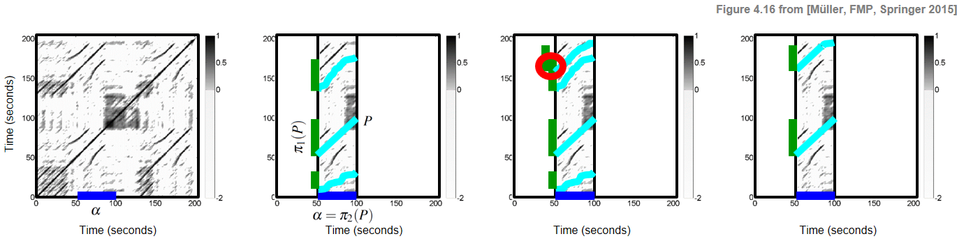 $$ \alpha^\ast := \underset{\alpha}{\mathrm{argmax}} \,\, \varphi(\alpha). $$By construction of the fitness measure, this segment has nonoverlapping repetitions that cover a possibly large portion of the audio recording. Furthermore, these repetitions are given by the induced segments obtained by the optimal path family of $\alpha^\ast$ yielding a segmentation of the audio recording into pairwise disjoint segments. To account for prior knowledge and to remove spurious estimates, one can impose additional requirements on the thumbnail solution. In particular, introducing a lower bound $\theta$ for the minimal possible thumbnail length allows us to reduce the effect of noise scattered in the underlying self-similarity matrix. Extending the above definition, we define