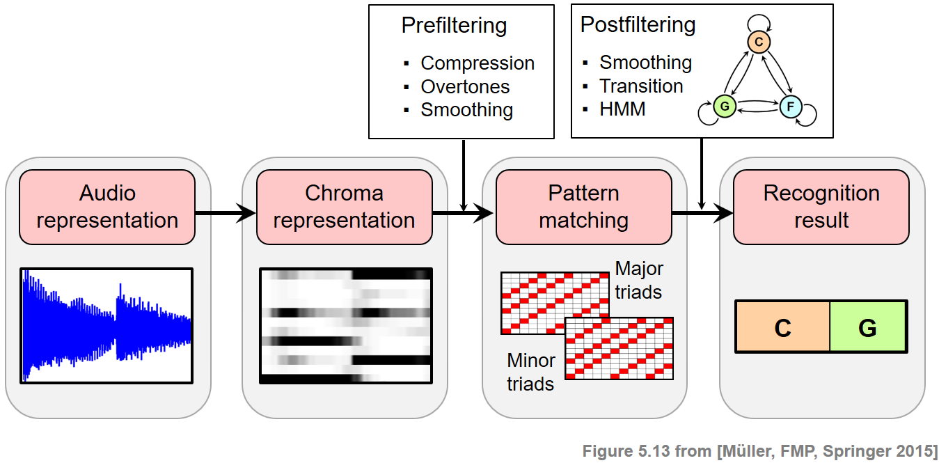 To improve the chord recognition results, additional enhancement techniques are applied either before the pattern matching step (referred to as prefiltering) or after/within the pattern matching step (referred to as postfiltering). In this notebook, we introduce a first chord recognition procedure that employs a simple template-based matching strategy.