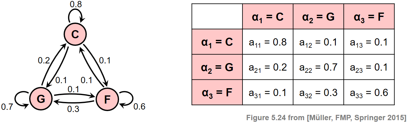 \begin{equation} a_{ij} := P[s_{n+1}=\alpha_{j} | s_{n}=\alpha_{i}] \in [0,1] \end{equation}for $i,j\in[1:I]$. These coefficients are also called state transition probabilities. They obey the standard stochastic constraint $\sum_{j=1}^{I} a_{ij} = 1$ and can be expressed by an $(I\times I)$ matrix, which we denote by $A$. A system that satisfies these properties is also called a (discrete-time) Markov chain. The following figure illustrates these definitions. It defines a Markov chain that consists of $I=3$ states $\alpha_{1}$, $\alpha_{2}$, and $\alpha_{3}$, which correspond to the major chords $\mathbf{C}$, $\mathbf{G}$, and $\mathbf{F}$, respectively. In the graph representation, the states correspond to the nodes, the transitions to the edges, and the transition probabilities to the labels attached to the edges. For example, the transition probability to remain in the state $\alpha_{1}=\mathbf{C}$ is $a_{11}=0.8$, whereas the transition probability of changing from $\alpha_{1}=\mathbf{C}$ to $\alpha_{2}=\mathbf{G}$ is $a_{12}=0.1$.