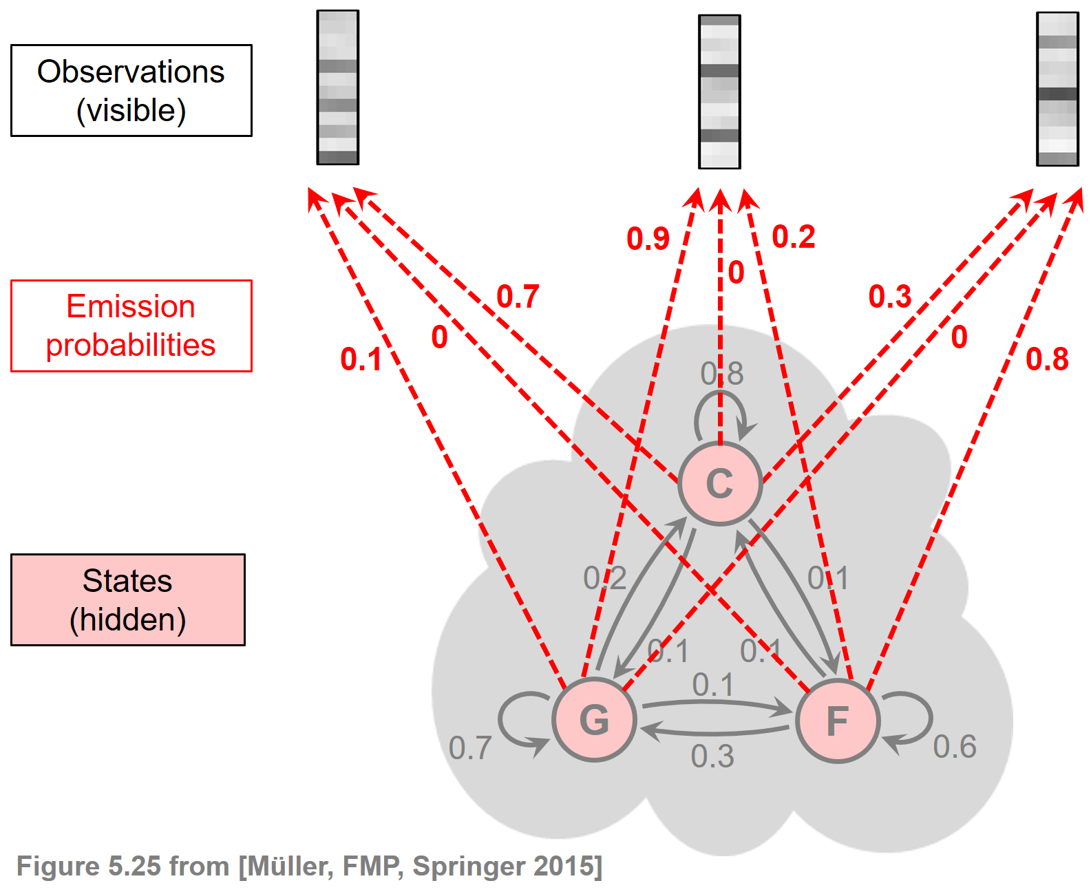 Based on a Markov chain, one can compute a probability for a given observation consisting of a sequence of states or chord types. In our chord recognition scenario, however, this is not what we need. Rather than observing a sequence of chord types, we observe a sequence of chroma vectors that are somehow related to the chord types. In other words, the state sequence is not directly visible, but only a fuzzier observation sequence that is generated based on the state sequence. This leads to an extension of Markov chains to a statistical model referred to as a hidden Markov model (HMM). The idea is to represent the relation between the observed feature vectors and the chord types (the states) using a probabilistic framework. Each state is equipped with a probability function that expresses the likelihood for a given chord type to output or emit a certain feature vector. As a result, we obtain a two-layered process consisting of a hidden layer and an observable layer. The hidden layer produces a state sequence that is not observable ("hidden"), but generates the observation sequence on the basis of the state-dependent probability functions.