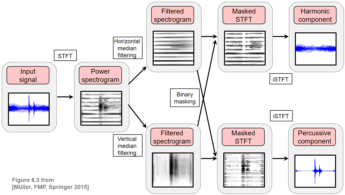 The goal of harmonic–percussive separation (HPS) is to decompose a given audio signal into two parts: one consisting of the harmonic and another of the percussive events. This task is rather vague since it often remains unclear whether a sound event is actually of harmonic or percussive nature. Indeed, there are many sounds such as white noise or applause which are neither harmonic nor percussive. Closely following the work by Fitzgerald, we introduce an HPS procedure as illustrated in the figure below. The idea is to filter a spectrogram representation of the given signal in the horizontal direction (along time) to enhance harmonic events while suppressing percussive ones. Similarly, the spectrogram is filtered in the vertical direction (along frequency) to enhance percussive events while suppressing harmonic ones. The two resulting filtered spectrograms are used to generate time–frequency masks, which are then applied to the original spectrogram. From the masked spectrogram representations, the harmonic and percussive parts of the signal are obtained by applying an inverse STFT.