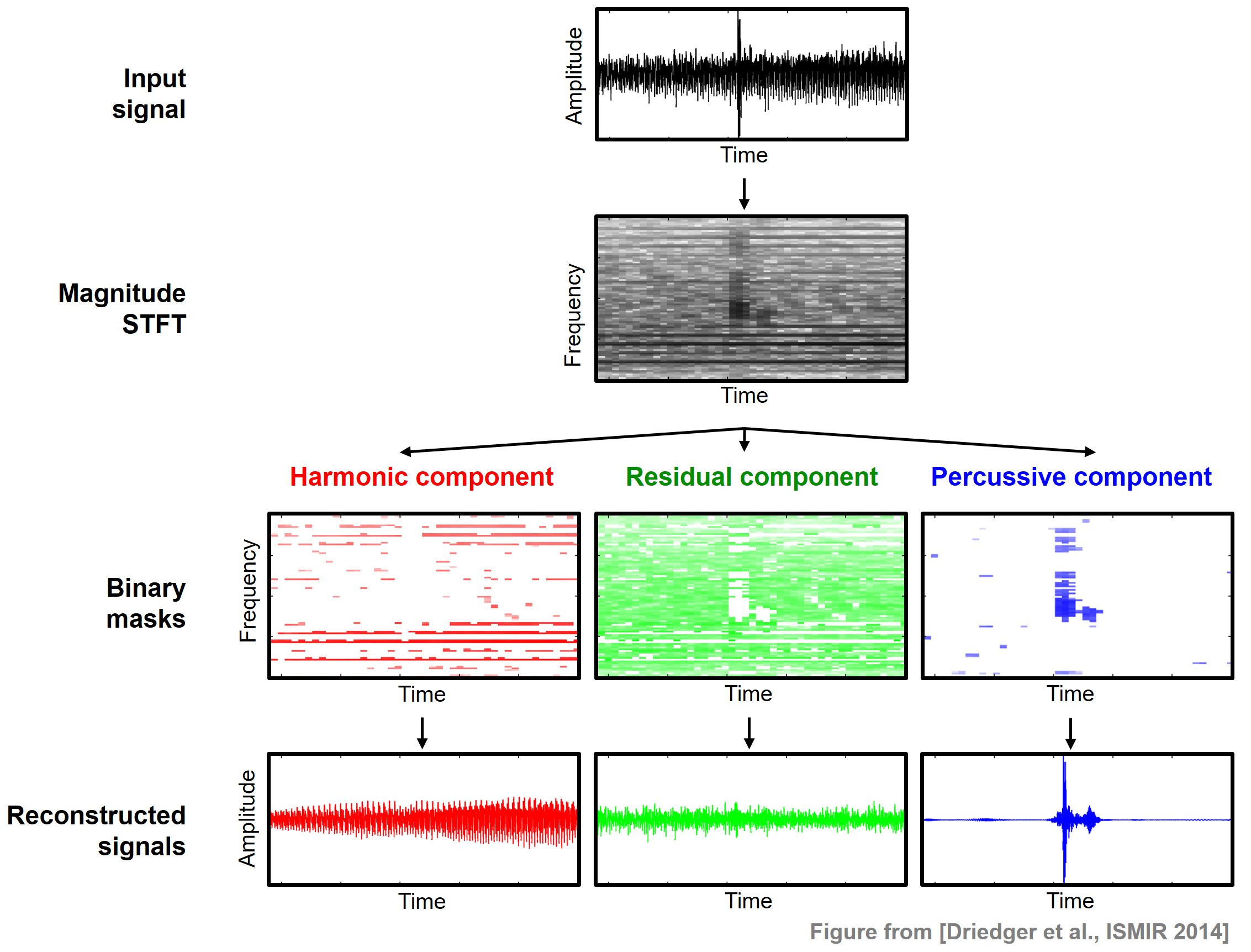 \begin{eqnarray*} \mathcal{X}^\mathrm{h}(n,k) &:=& \mathcal{M}^\mathrm{h}(n,k) \cdot \mathcal{X}(n,k), \\ \mathcal{X}^\mathrm{p}(n,k) &:=& \mathcal{M}^\mathrm{p}(n,k) \cdot \mathcal{X}(n,k), \\ \mathcal{X}^\mathrm{r}(n,k) &:=& \mathcal{M}^\mathrm{r}(n,k) \cdot \mathcal{X}(n,k) \end{eqnarray*}for $n,k\in\mathbf{Z}$. Finally, one can derive time-domain signal $x^\mathrm{h}$, $x^\mathrm{p}$, and $x^\mathrm{r}$ by applying an inverse STFT. The following function HRPS implements this procedure.
