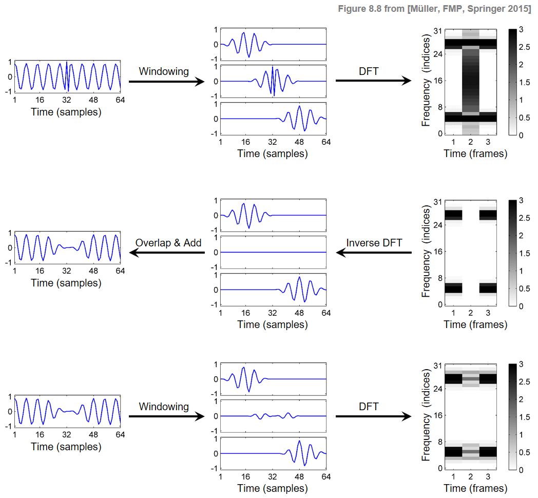 \begin{equation} (v_n(0),\ldots, v_n(N-1))^\top := \mathrm{DFT}_N^{-1} \Big((\mathcal{X}^\mathrm{mod}(n,0),\ldots, \mathcal{X}^\mathrm{mod}d(n,N-1))^\top\Big) \end{equation}for $n\in\mathbb{Z}$. Furthermore, we set $v_n(r):=0$ for $r\in\mathbb{Z}\setminus[0:N-1]$. Then, applying an overlap–add technique, we define a signal $x^\mathrm{Rec}:\mathbb{Z}\to\mathbb{R}$ by setting