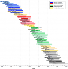 For the classification experiments in [2-4], we tried to avoid ambiguous tasks and only considered the classes Baroque, Classical, Romantic, and Modern were considered (1600 pieces). To this end, we did not include composers whose stylistic attribution is rather ambiguous. For example, we did not select works by Beethoven or Schubert since these composers show influences from both Classical and Romantic styles. As a consequence, the data does not show an equal distribution with respect to the composers' lifetimes but exhibits some historical gaps. To overcome this problem, we created an additional set of recordings comprising works by such transitional composers. This "Add-On" set includes each 200 piano and orchestra pieces and serves to fill the gaps between the historical periods. We end up with a more or less balanced distribution, which enables the analysis of style characteristics over history as published in [1]. The table gives an overview of the classes and the respective composers. A graphical overview can be found at the end of this site.